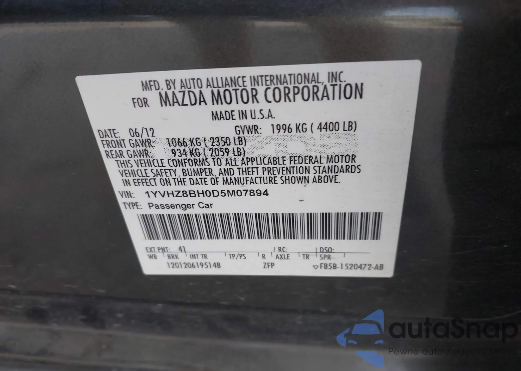 Samochód Mazda 6 2013 (VIN 1YVHZ8BH0D5M07894) nie był wcześniej licytowany. Dokumenty są czyste, przebieg odpowiada lub jest niższy niż średnia rynku. Sprzedaje go firma ubezpieczeniowa – polecamy zakup. Dostawa do portu zajmie ok. 6–8 tygodni.