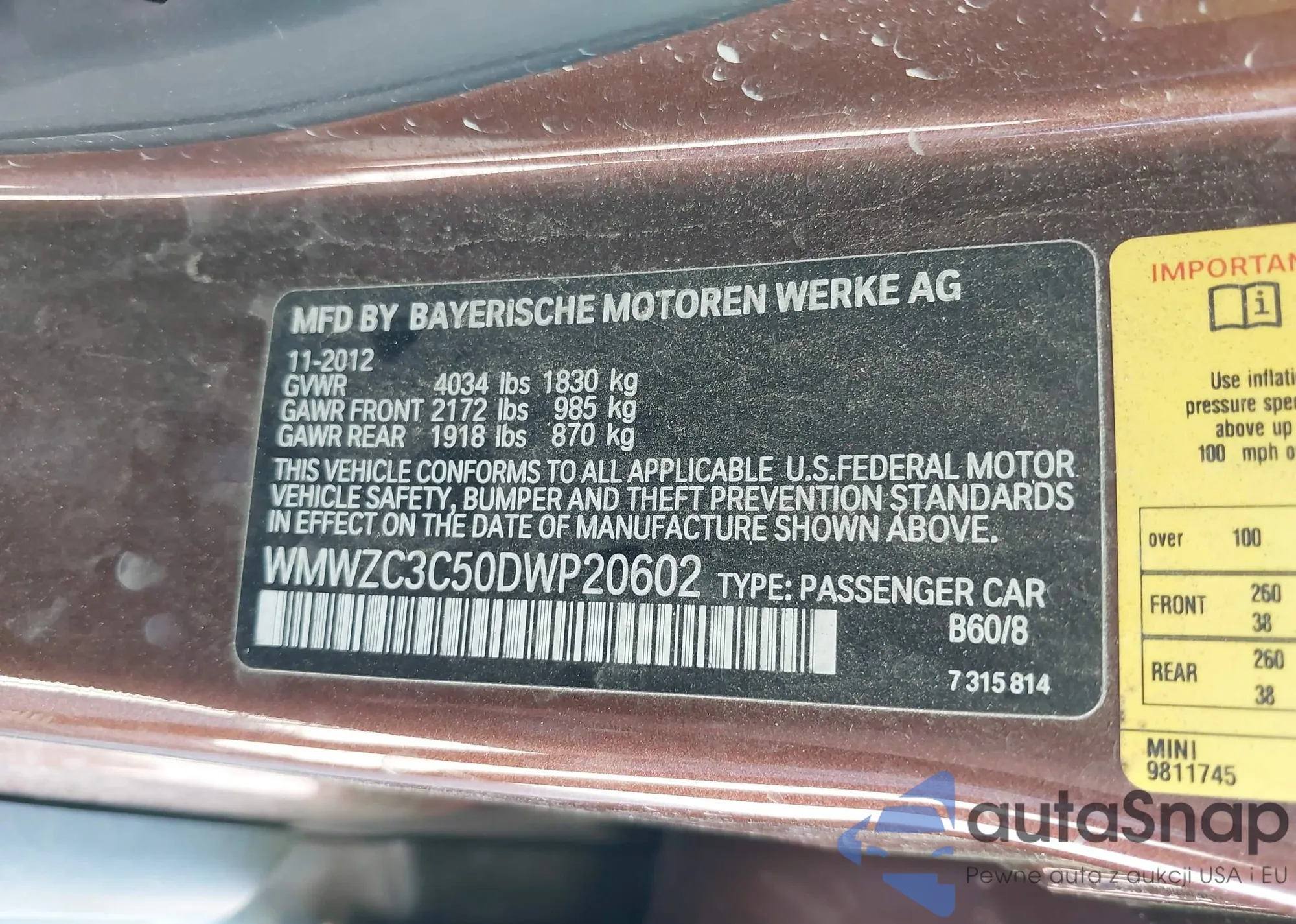 Samochód MINI Countryman 2013 (VIN WMWZC3C50DWP20602) ma dokumenty uniemożliwiające rejestrację. Mogą pojawić się trudności przy eksporcie i rejestracji. Skontaktuj się z ekspertami AutaSnap w celu znalezienia alternatywy.