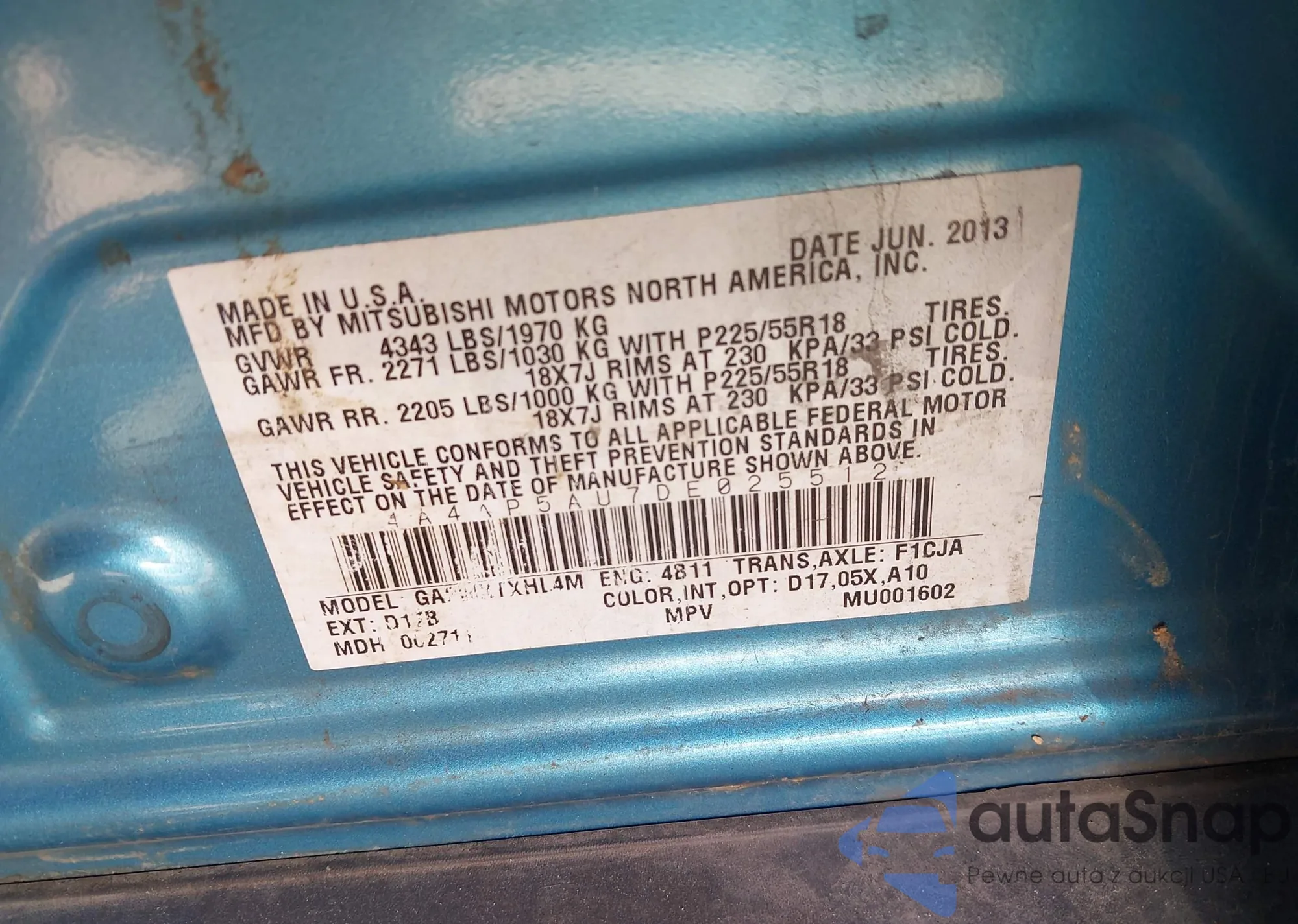 Samochód Mitsubishi Outlander 2013 (VIN 4A4AP5AU7DE025512) nie był wcześniej licytowany. Dokumenty są czyste, przebieg odpowiada lub jest niższy niż średnia rynku. Sprzedaje go firma ubezpieczeniowa – polecamy zakup. Dostawa do portu zajmie ok. 6–8 tygodni.