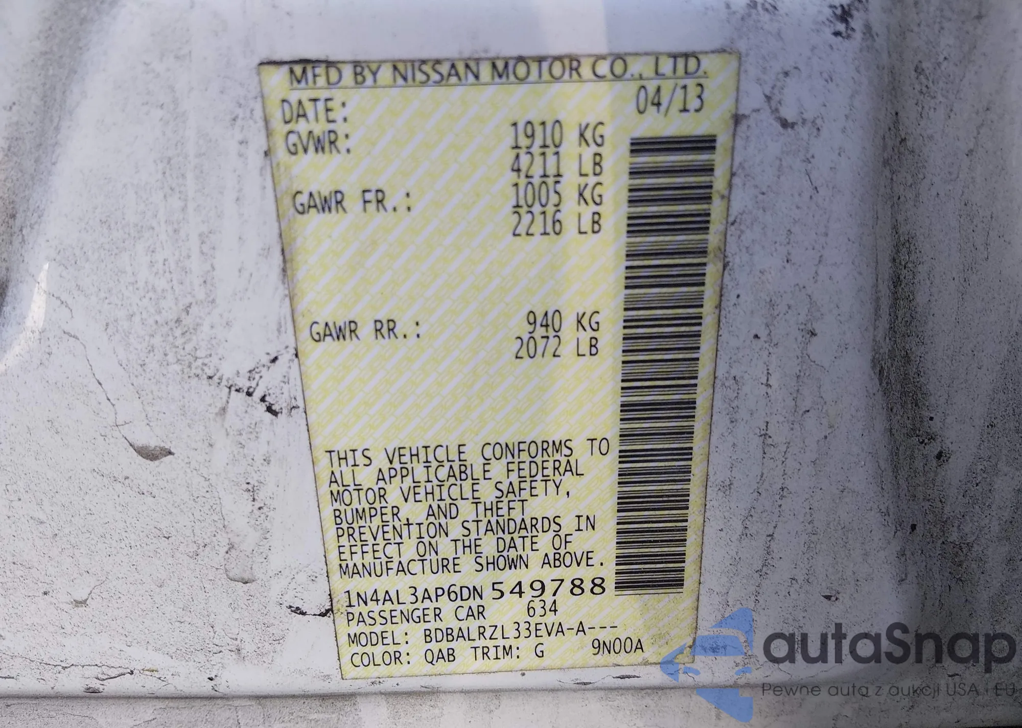 Samochód Nissan Altima 2013 (VIN 1N4AL3AP6DN549788) nie był wcześniej licytowany. Dokumenty są czyste, przebieg odpowiada lub jest niższy niż średnia rynku. Sprzedaje go firma ubezpieczeniowa – polecamy zakup. Dostawa do portu zajmie ok. 6–8 tygodni.