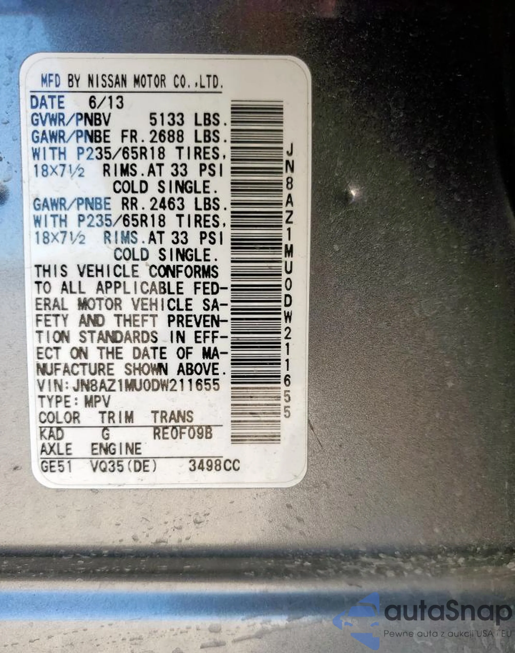 VIN: JN8AZ1MU0DW211655