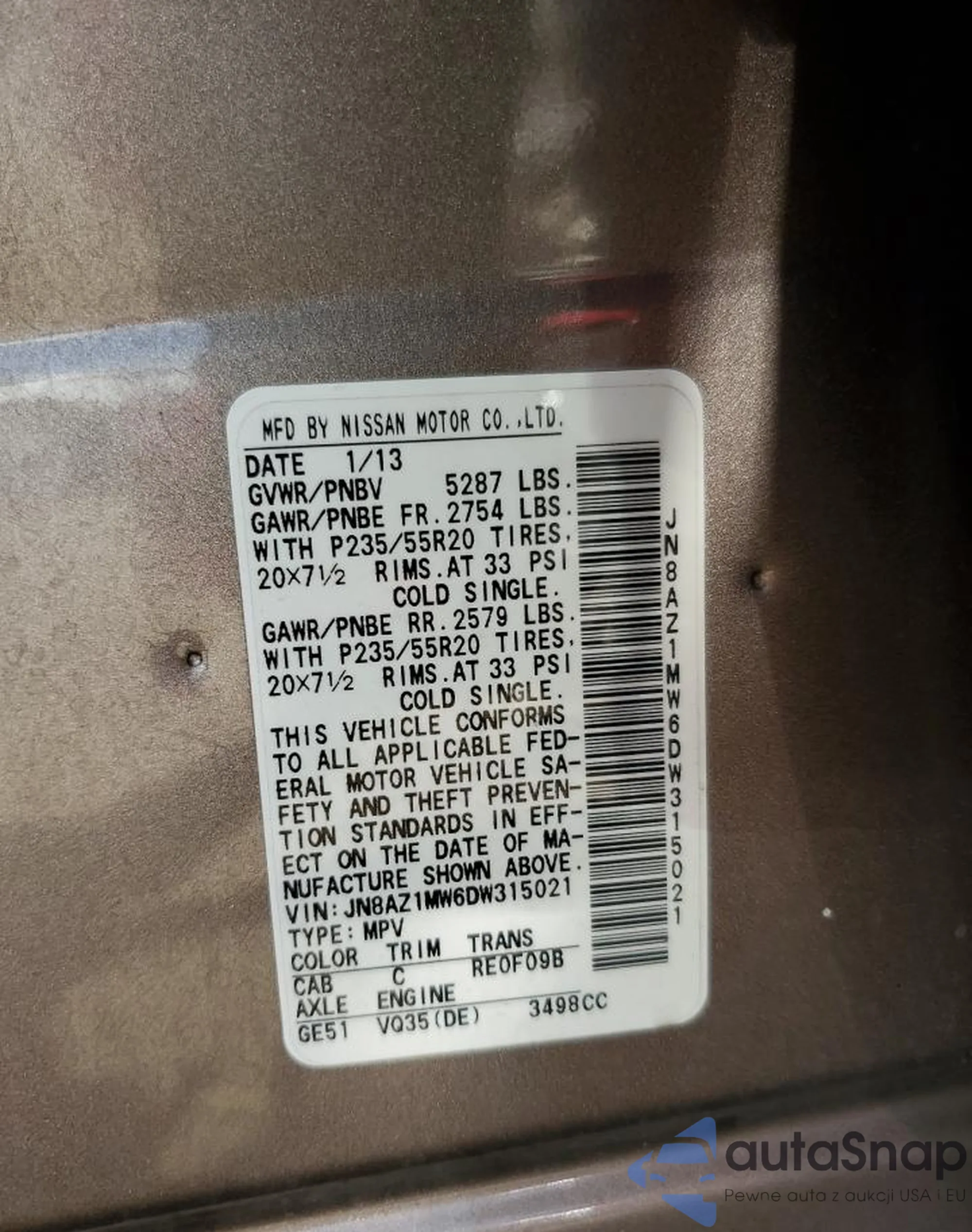 VIN: JN8AZ1MW6DW315021