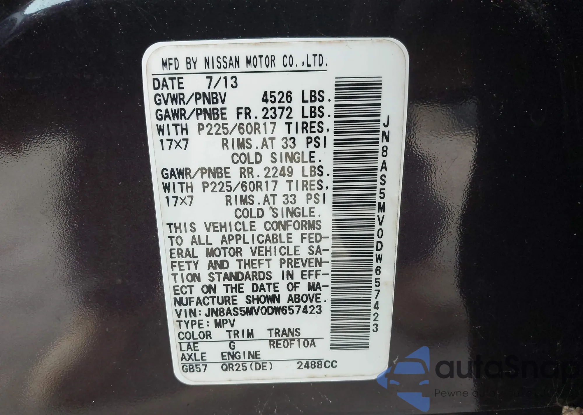 VIN: JN8AS5MV0DW657423