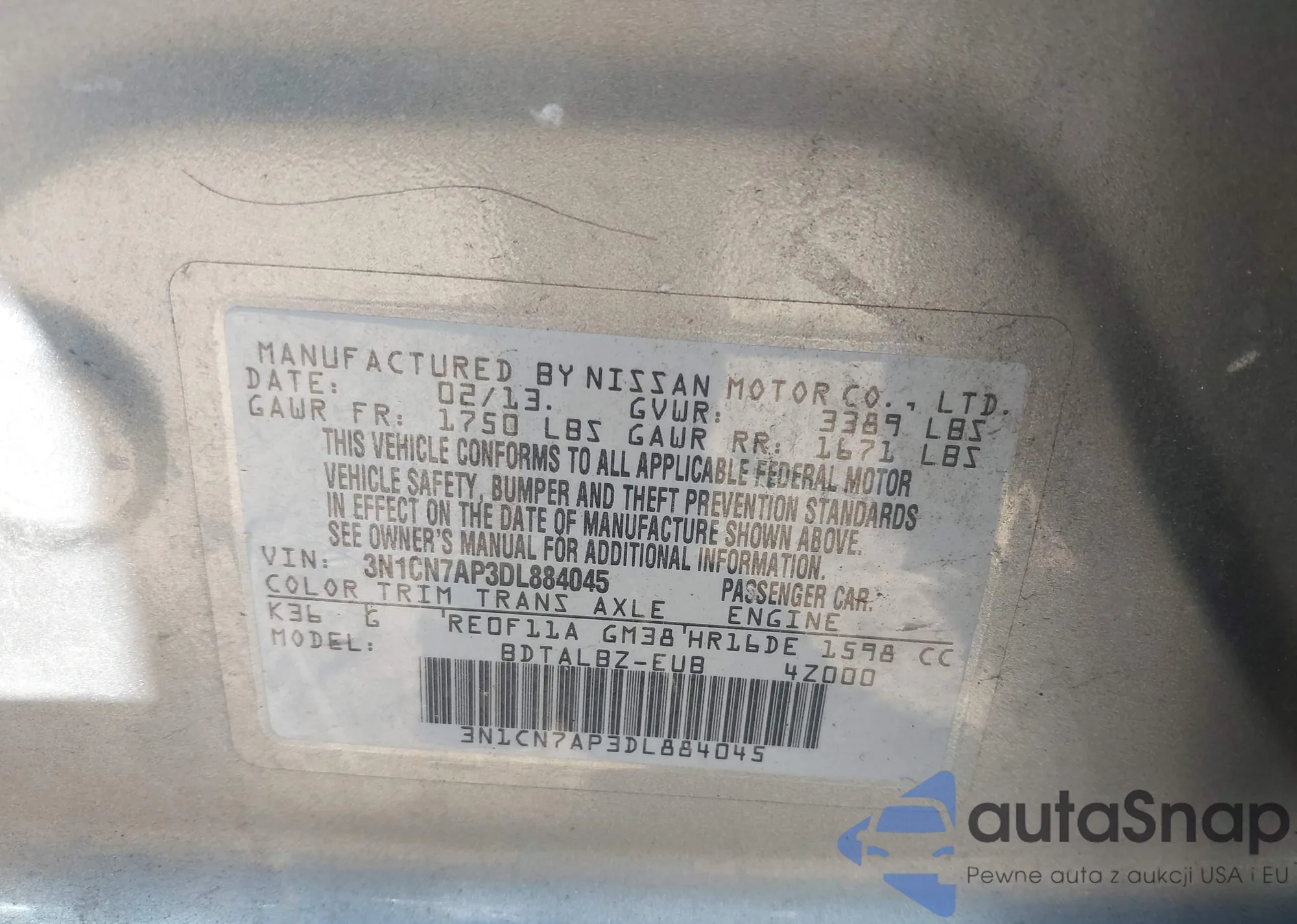 VIN: 3N1CN7AP3DL884045