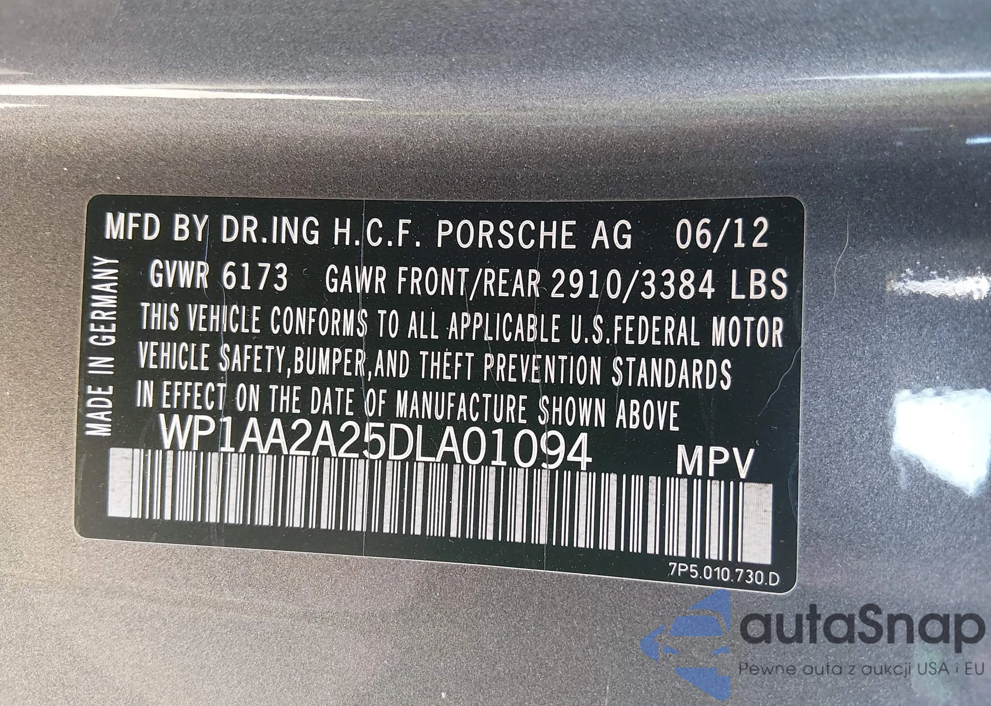 Samochód Porsche Cayenne 2013 (VIN WP1AA2A25DLA01094) nie był wcześniej licytowany. Dokumenty są czyste, przebieg odpowiada lub jest niższy niż średnia rynku. Sprzedaje go firma ubezpieczeniowa – polecamy zakup. Dostawa do portu zajmie ok. 6–8 tygodni.