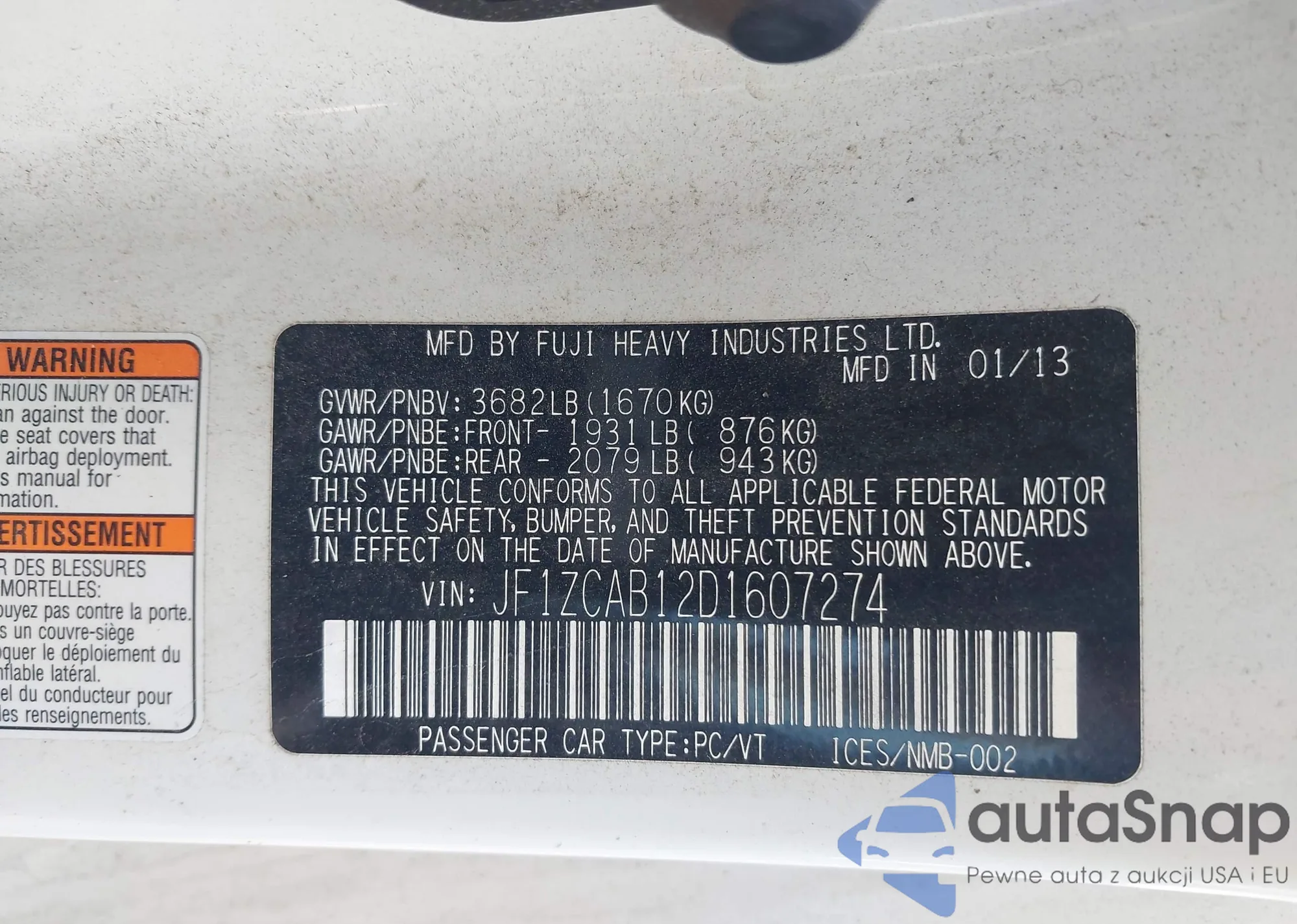 Samochód Subaru BRZ 2013 (VIN JF1ZCAB12D1607274) ma dokumenty uniemożliwiające rejestrację. Mogą pojawić się trudności przy eksporcie i rejestracji. Skontaktuj się z ekspertami AutaSnap w celu znalezienia alternatywy.