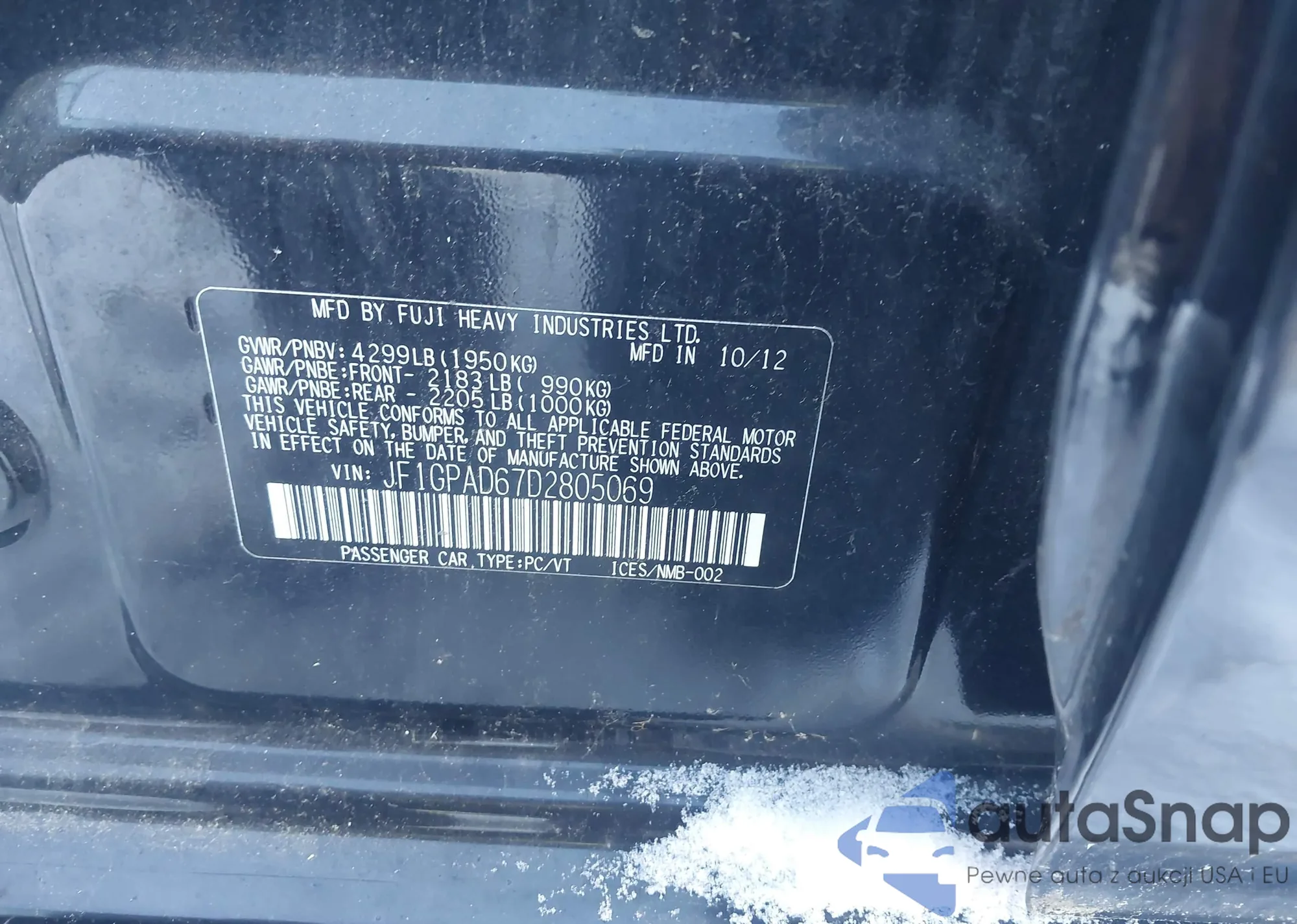Samochód Subaru Impreza 2013 (VIN JF1GPAD67D2805069) sprzedaje go niezweryfikowany sprzedawca. Zalecamy raport Carfax i potwierdzenie możliwości rejestracji pojazdu przed zakupem.