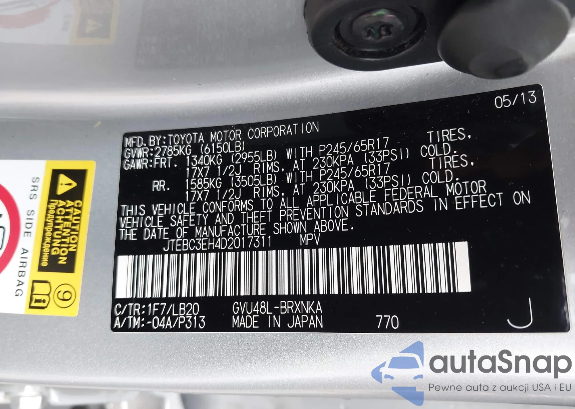 Samochód Toyota Highlander 2013 (VIN JTEBC3EH4D2017311) nie był wcześniej licytowany. Dokumenty są czyste, przebieg odpowiada lub jest niższy niż średnia rynku. Sprzedaje go firma ubezpieczeniowa – polecamy zakup. Dostawa do portu zajmie ok. 6–8 tygodni.