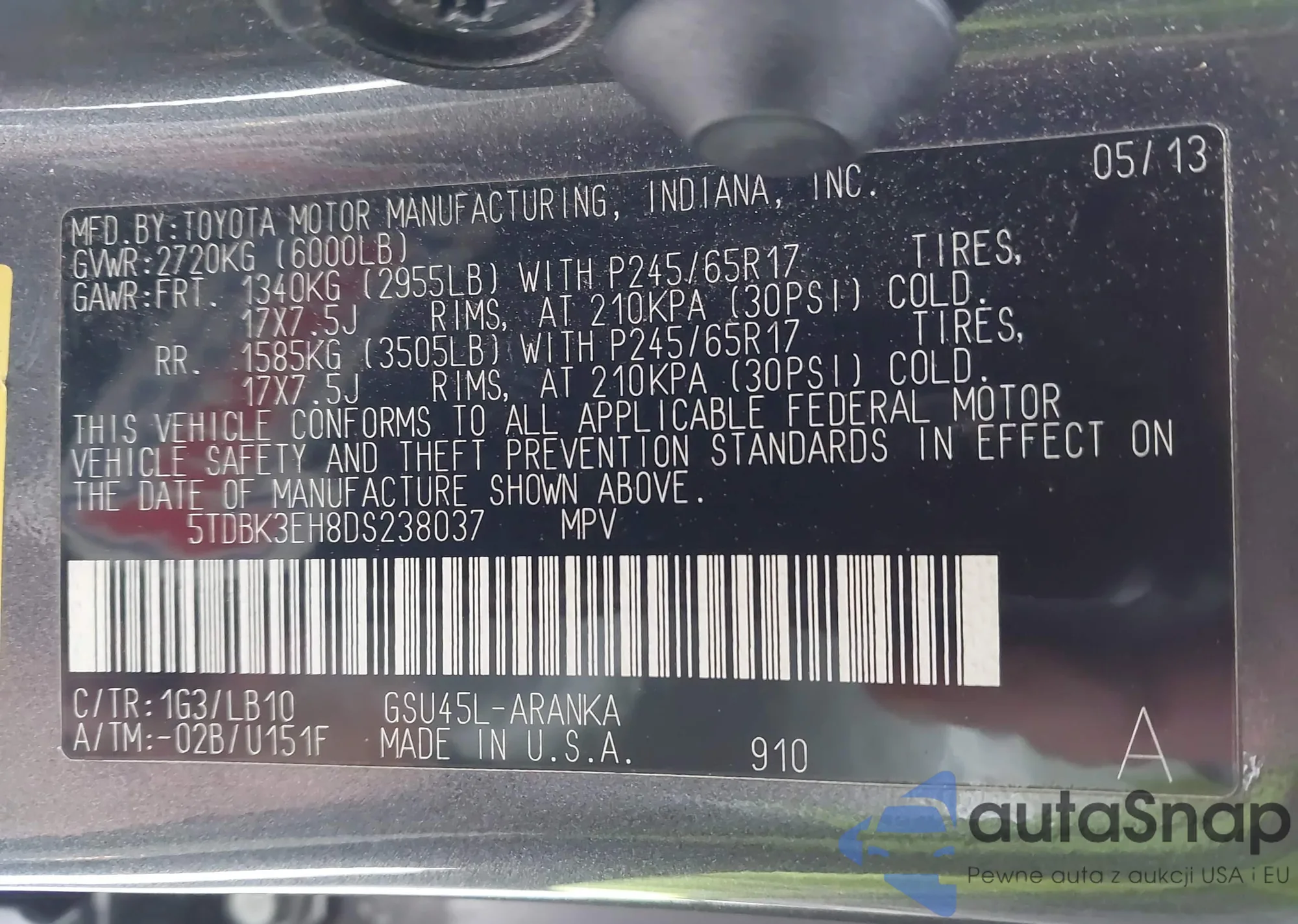 VIN: 5TDBK3EH8DS238037