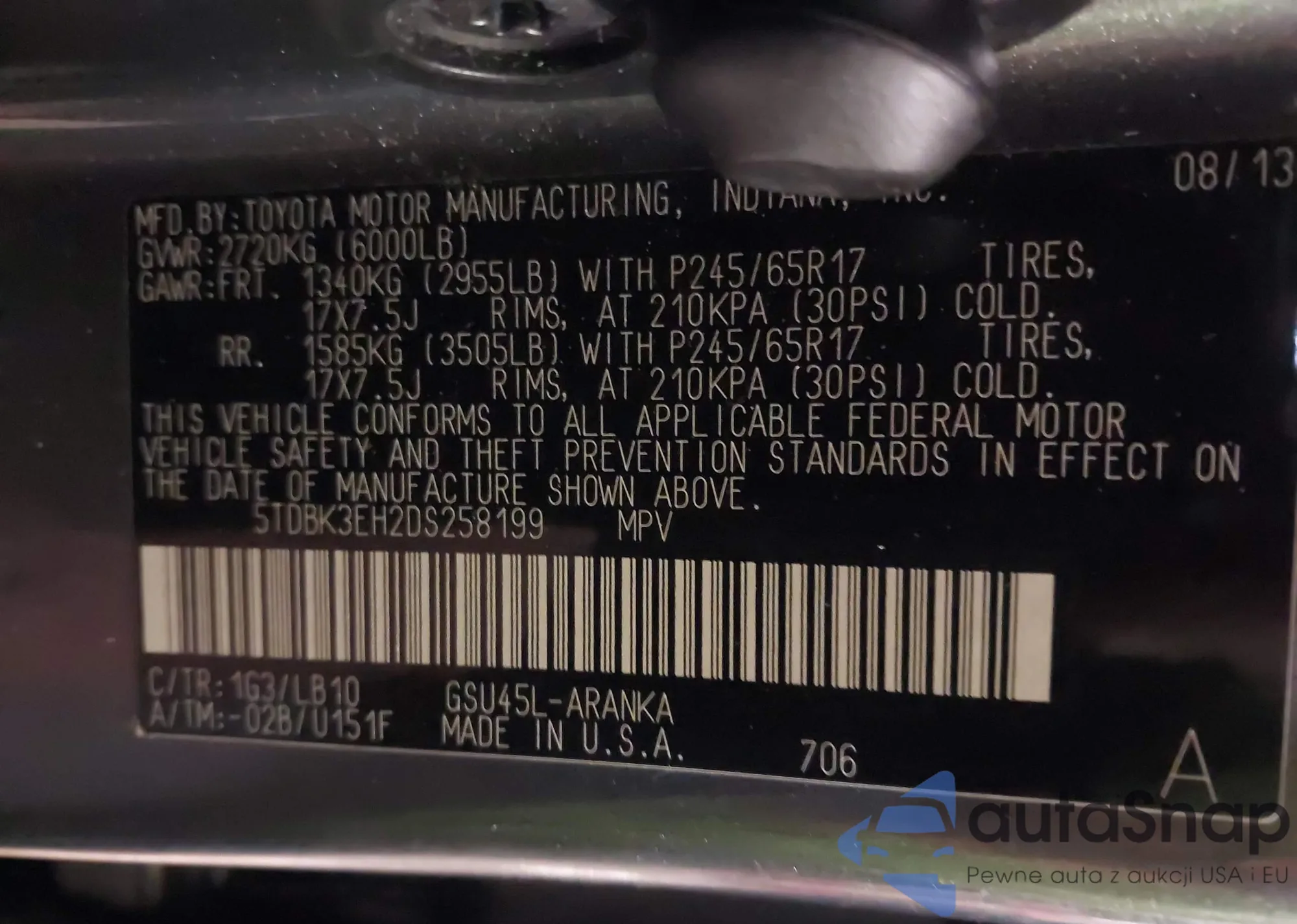 Samochód Toyota Highlander 2013 (VIN 5TDBK3EH2DS258199) nie był wcześniej licytowany. Dokumenty są czyste, przebieg odpowiada lub jest niższy niż średnia rynku. Sprzedaje go firma ubezpieczeniowa – polecamy zakup. Dostawa do portu zajmie ok. 6–8 tygodni.