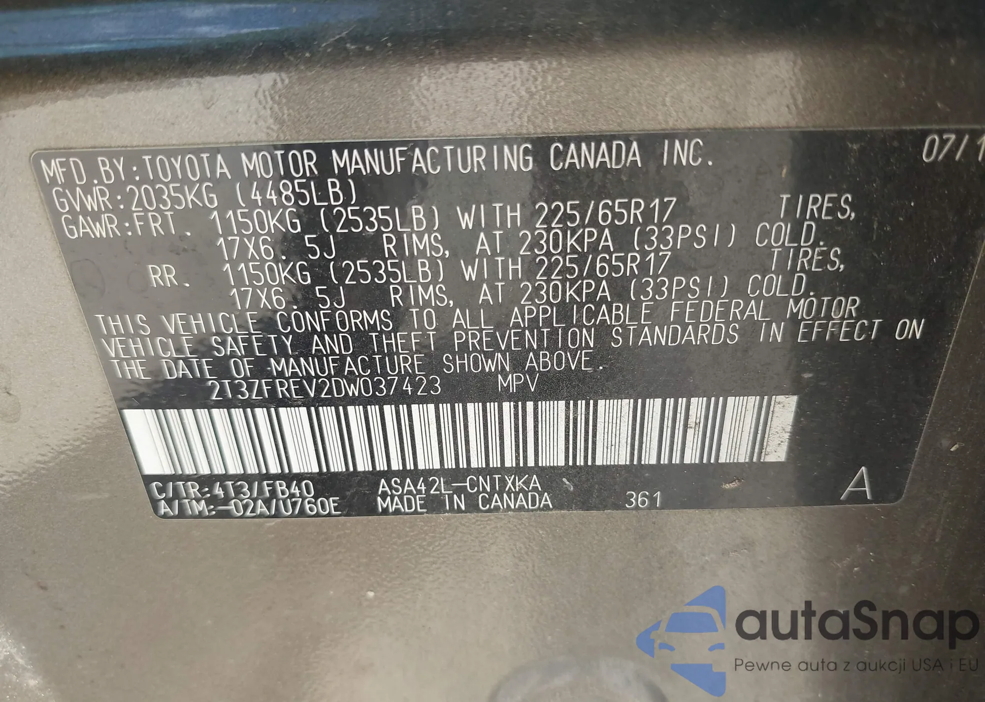 VIN: 2T3ZFREV2DW037423