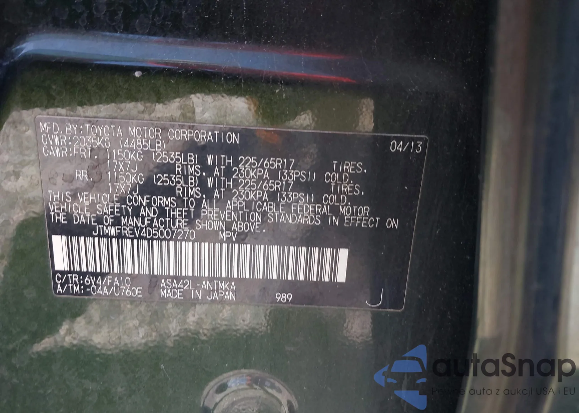 VIN: JTMWFREV4D5007270