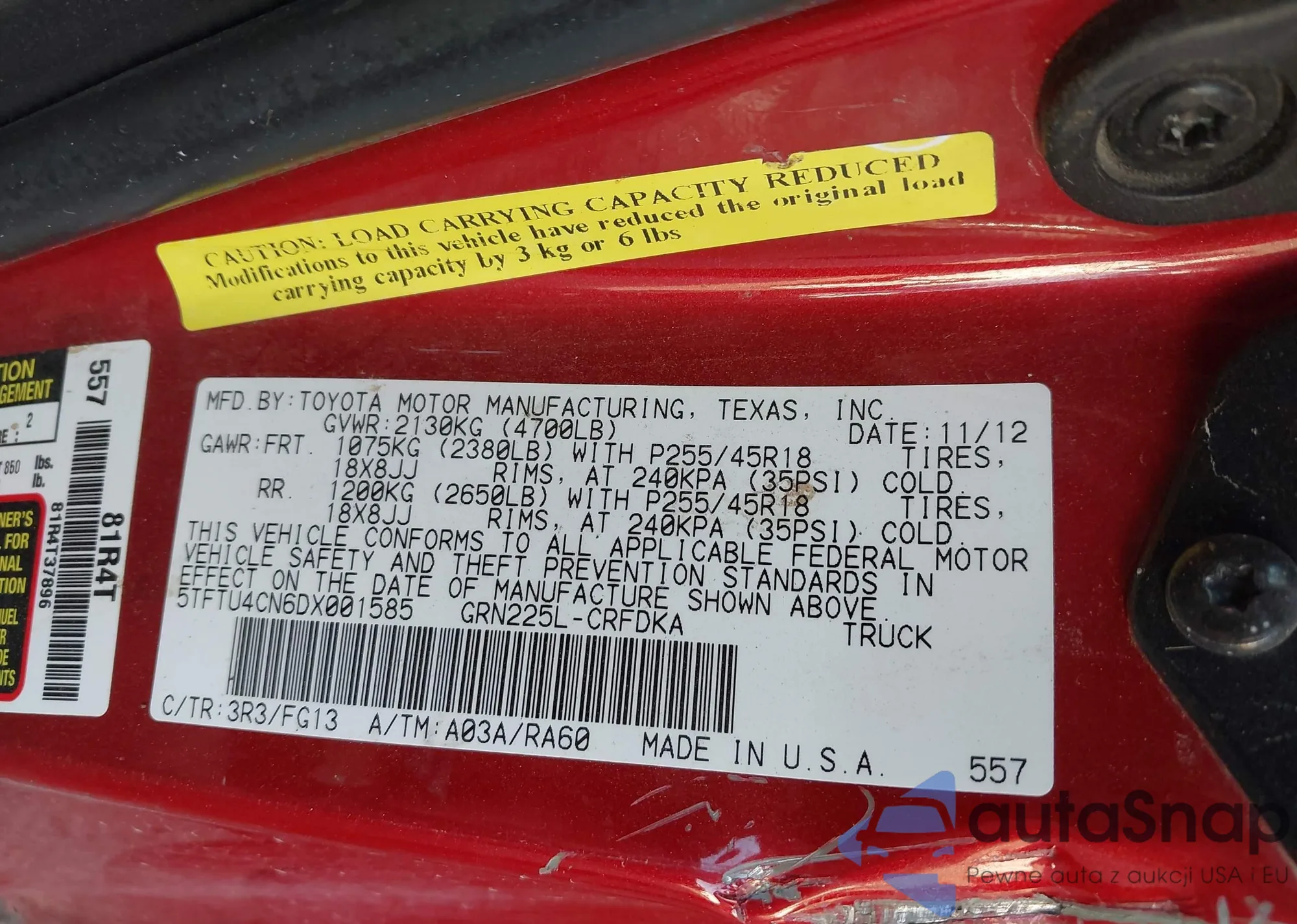 Samochód Toyota Tacoma 2013 (VIN 5TFTU4CN6DX001585) nie był wcześniej licytowany. Dokumenty są czyste, przebieg odpowiada lub jest niższy niż średnia rynku. Sprzedaje go firma ubezpieczeniowa – polecamy zakup. Dostawa do portu zajmie ok. 6–8 tygodni.