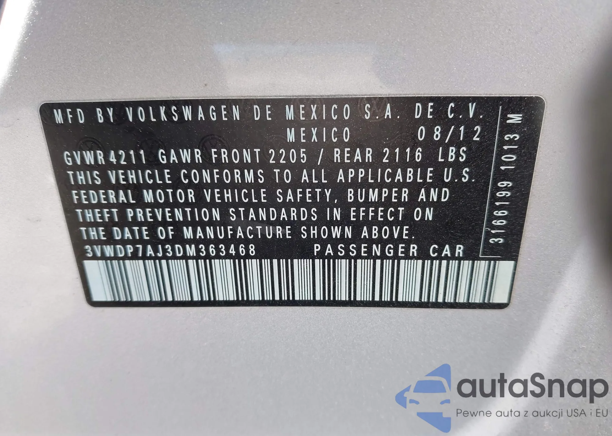 Samochód Volkswagen Jetta 2013 (VIN 3VWDP7AJ3DM363468) nie był wcześniej licytowany. Dokumenty są czyste, przebieg odpowiada lub jest niższy niż średnia rynku. Sprzedaje go firma ubezpieczeniowa – polecamy zakup. Dostawa do portu zajmie ok. 6–8 tygodni.
