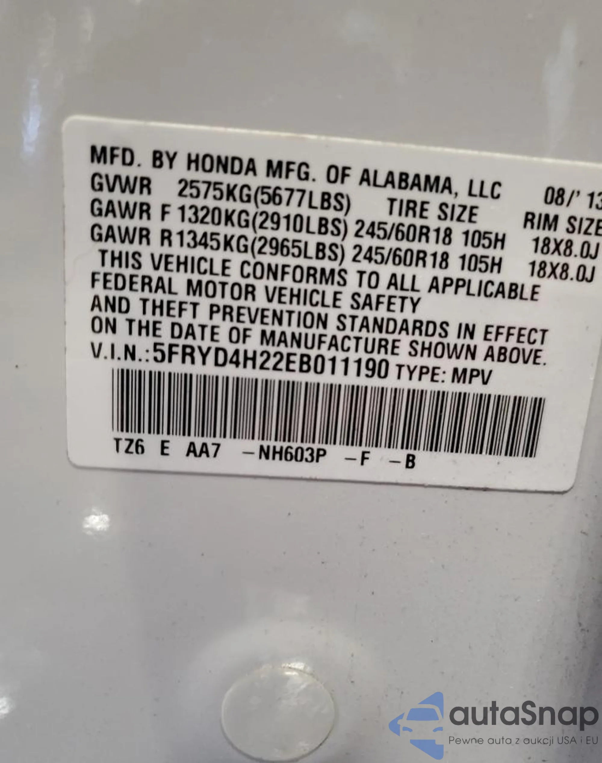 • VIN: 5FRYD4H22EB011190