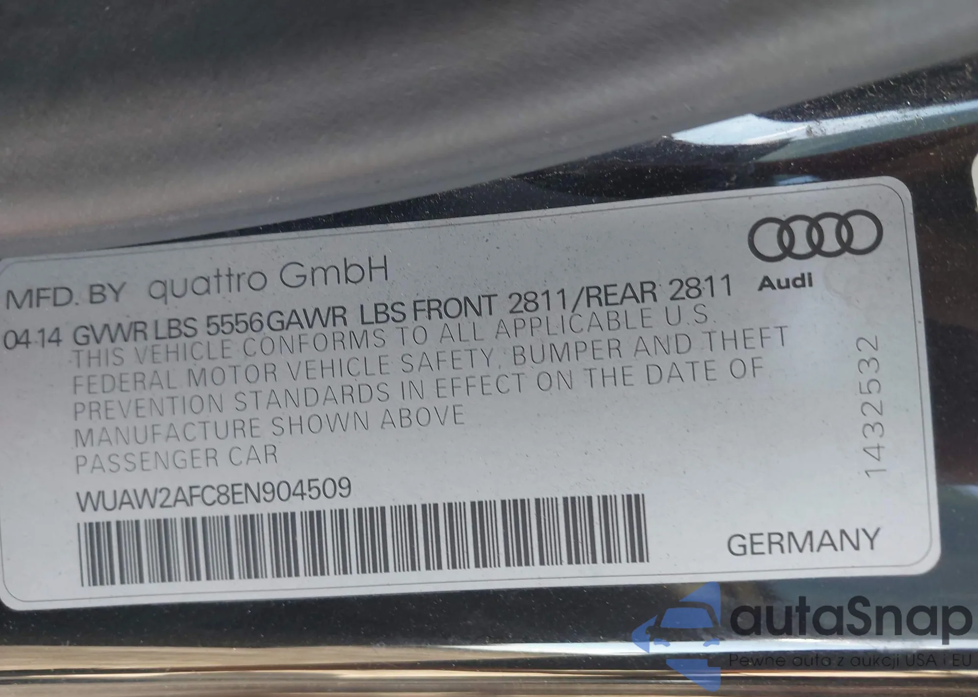 Samochód Audi RS7 2014 (VIN WUAW2AFC8EN904509) ma dokumenty uniemożliwiające rejestrację. Mogą pojawić się trudności przy eksporcie i rejestracji. Skontaktuj się z ekspertami AutaSnap w celu znalezienia alternatywy.