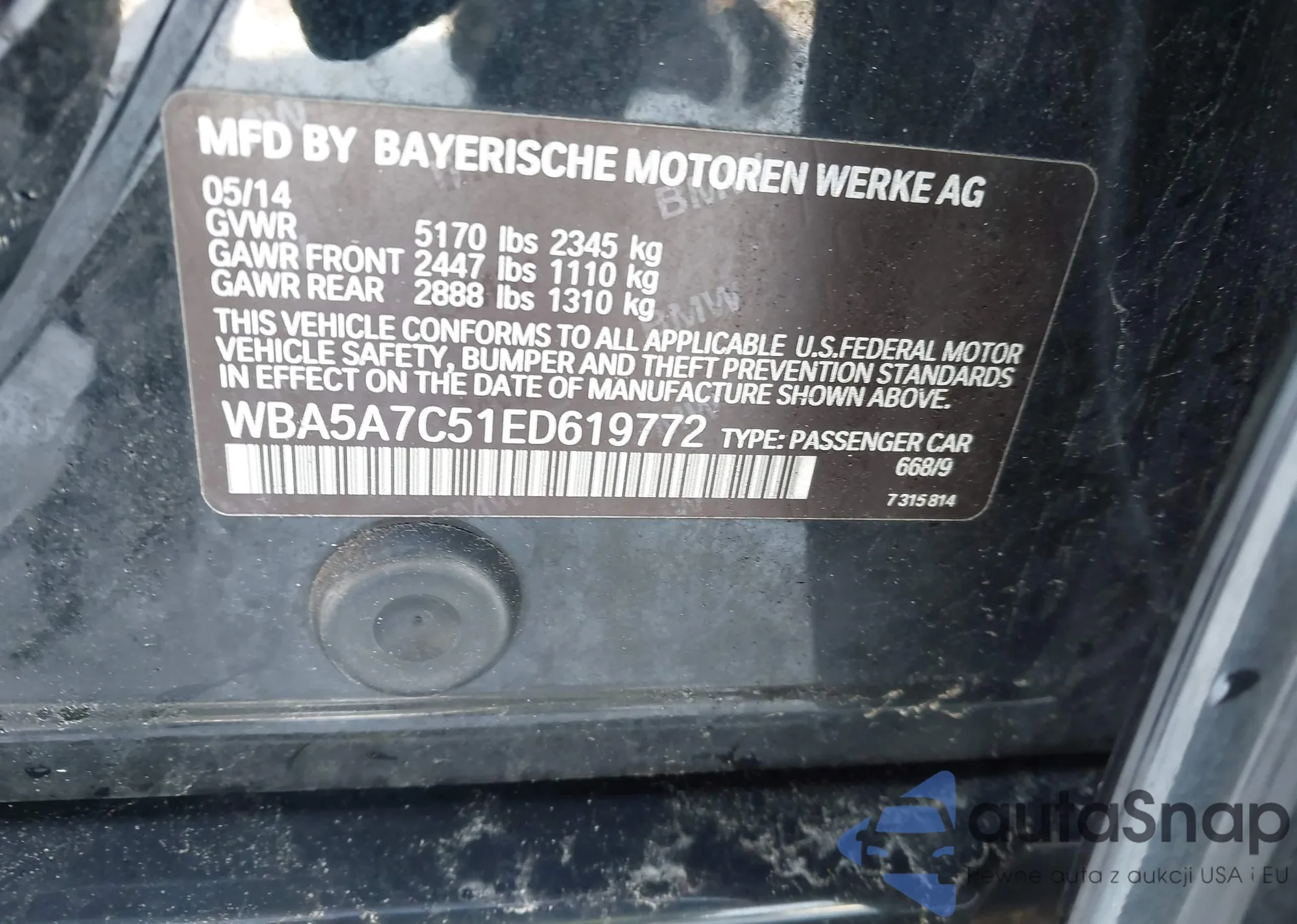 Samochód BMW 5er 2014 (VIN WBA5A7C51ED619772) nie był wcześniej licytowany. Dokumenty są czyste, przebieg odpowiada lub jest niższy niż średnia rynku. Sprzedaje go firma ubezpieczeniowa – polecamy zakup. Dostawa do portu zajmie ok. 6–8 tygodni.