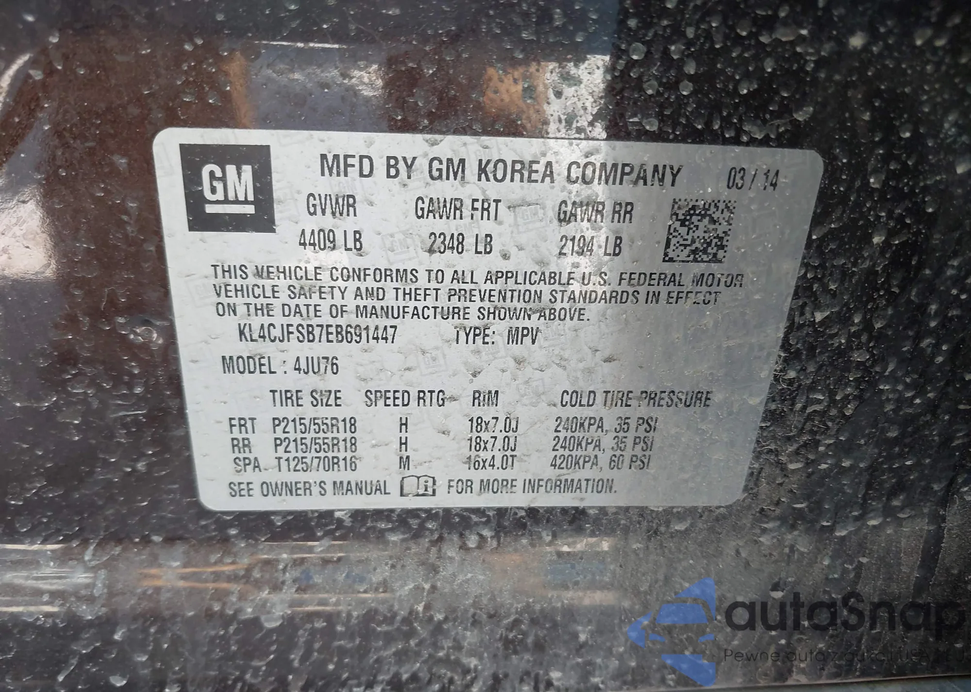 • VIN: KL4CJFSB7EB691447