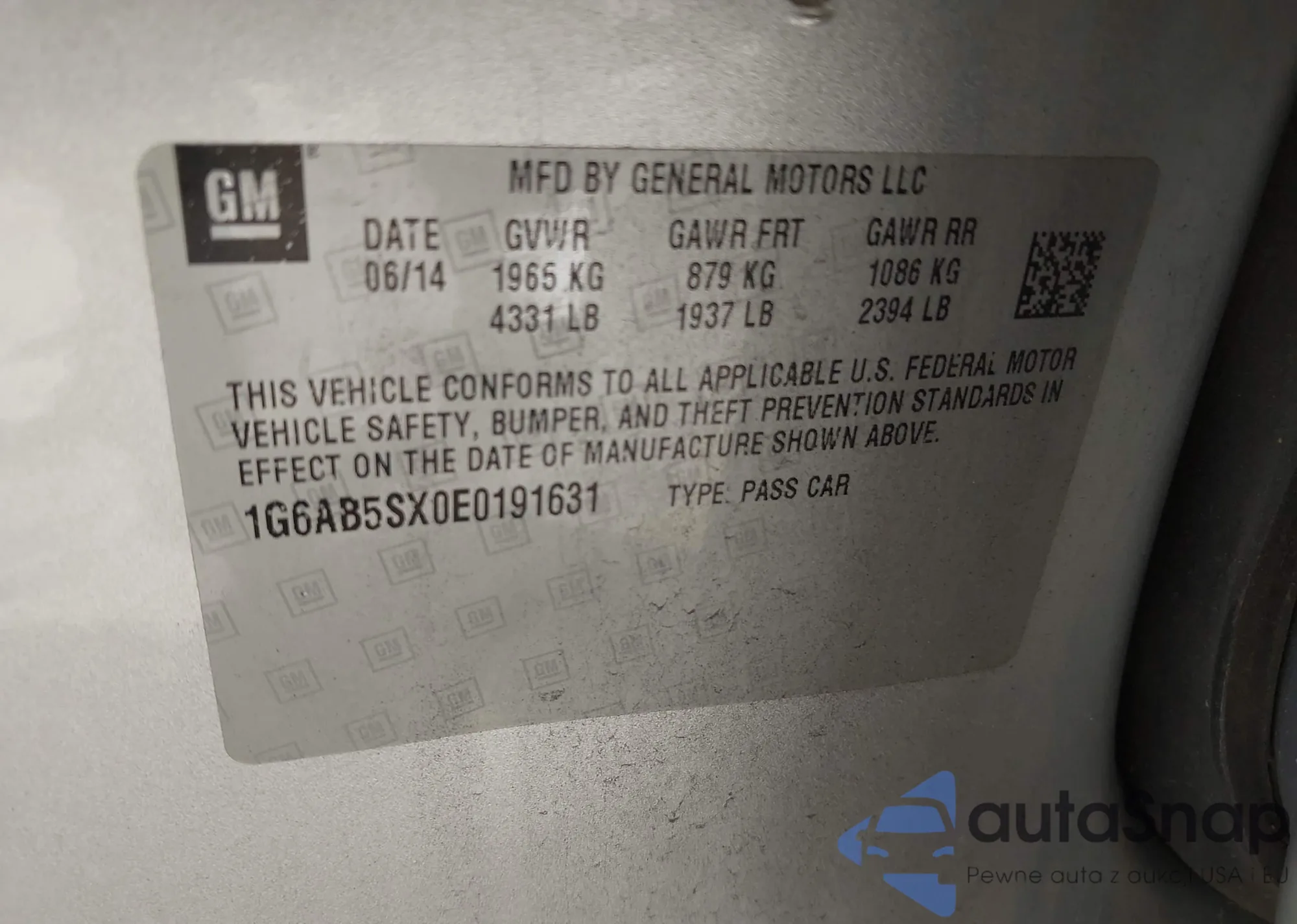 • VIN: 1G6AB5SX0E0191631
