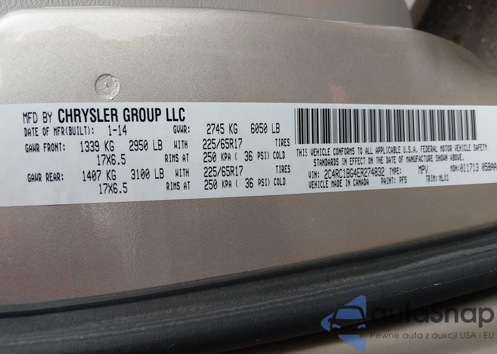 Samochód Chrysler Town & Country 2014 (VIN 2C4RC1BG4ER274832) sprzedaje go niezweryfikowany sprzedawca. Zalecamy raport Carfax i potwierdzenie możliwości rejestracji pojazdu przed zakupem.