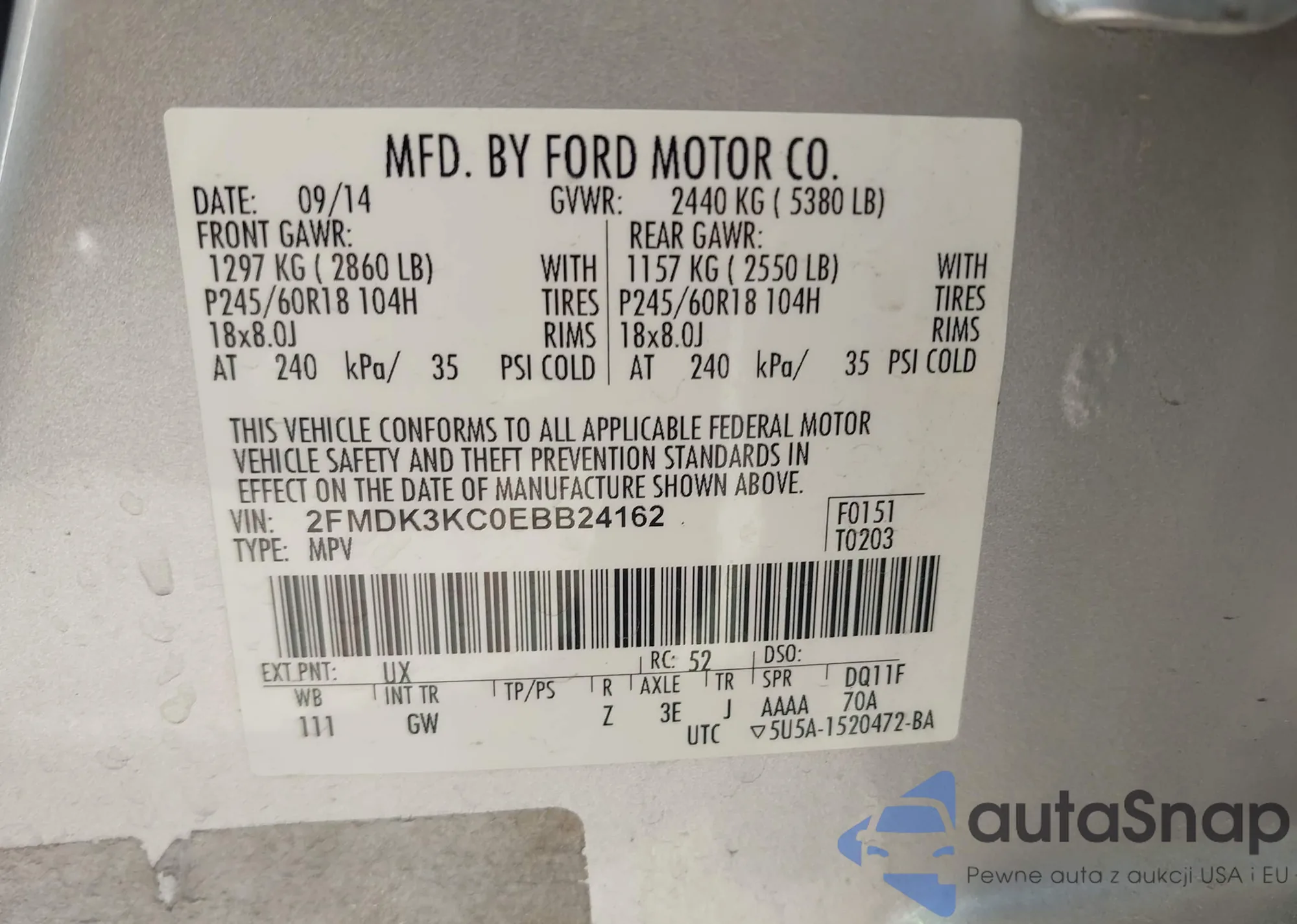 • VIN: 2FMDK3KC0EBB24162