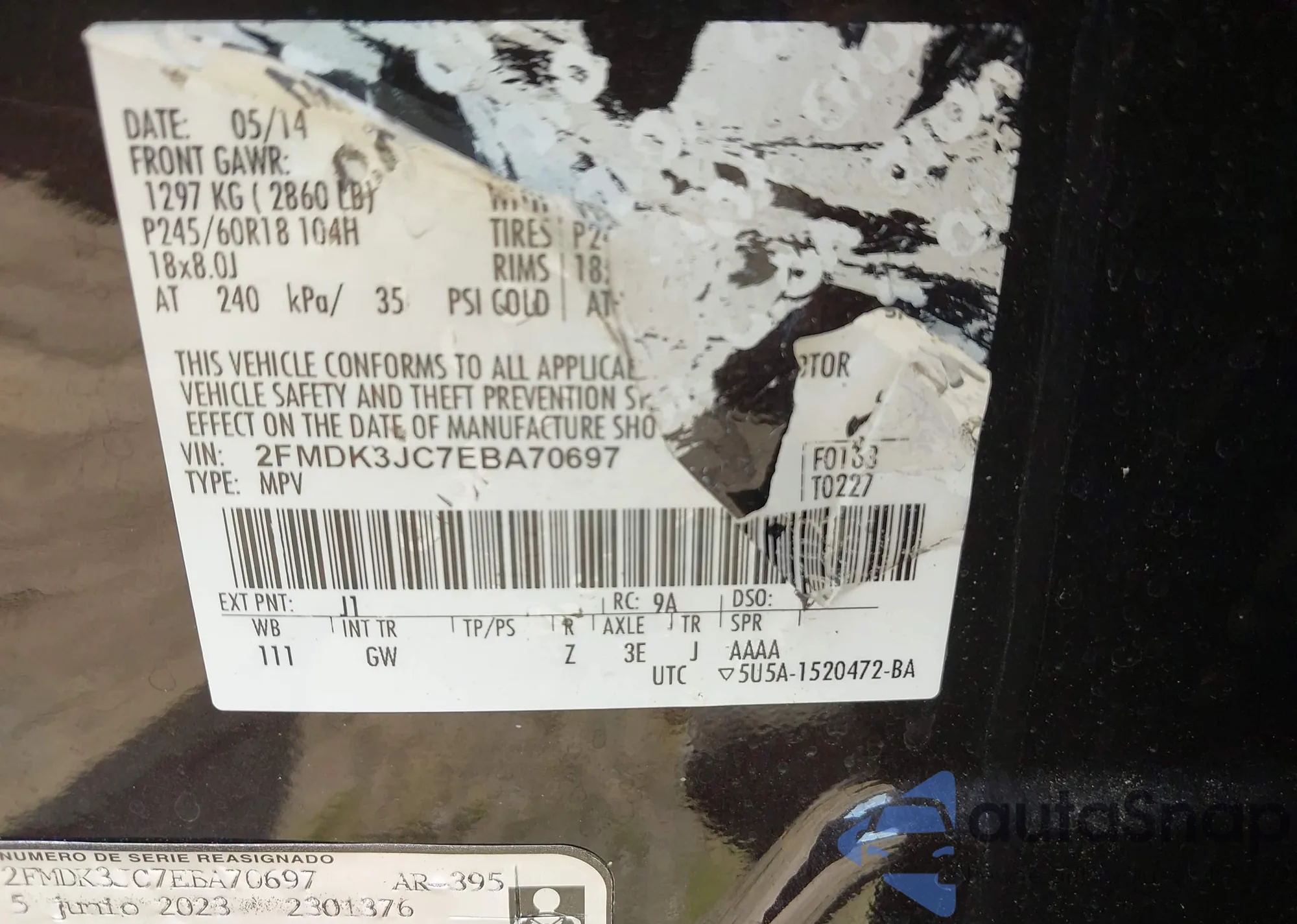 VIN: 2FMDK3JC7EBA70697
