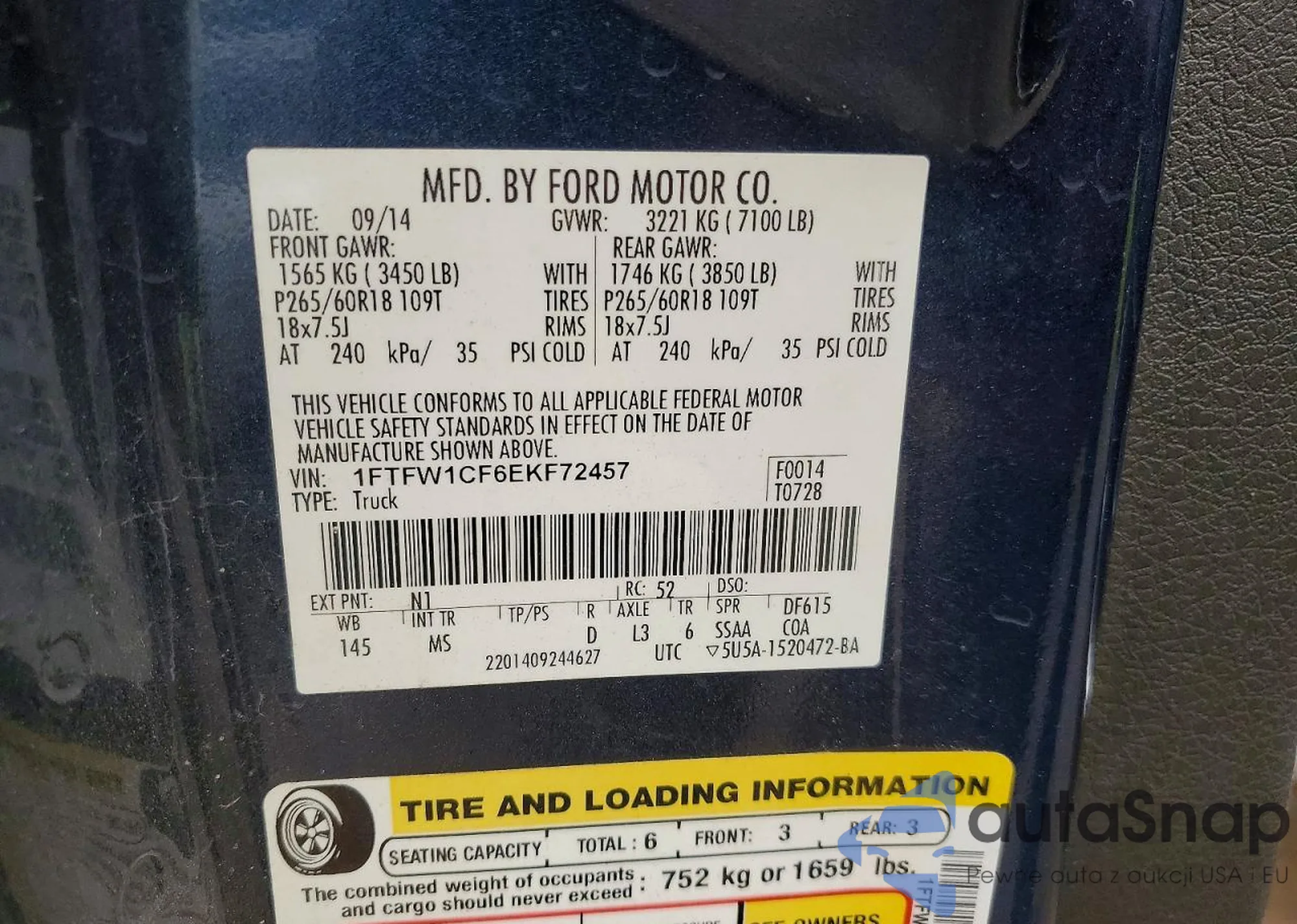 • VIN: 1FTFW1CF6EKF72457