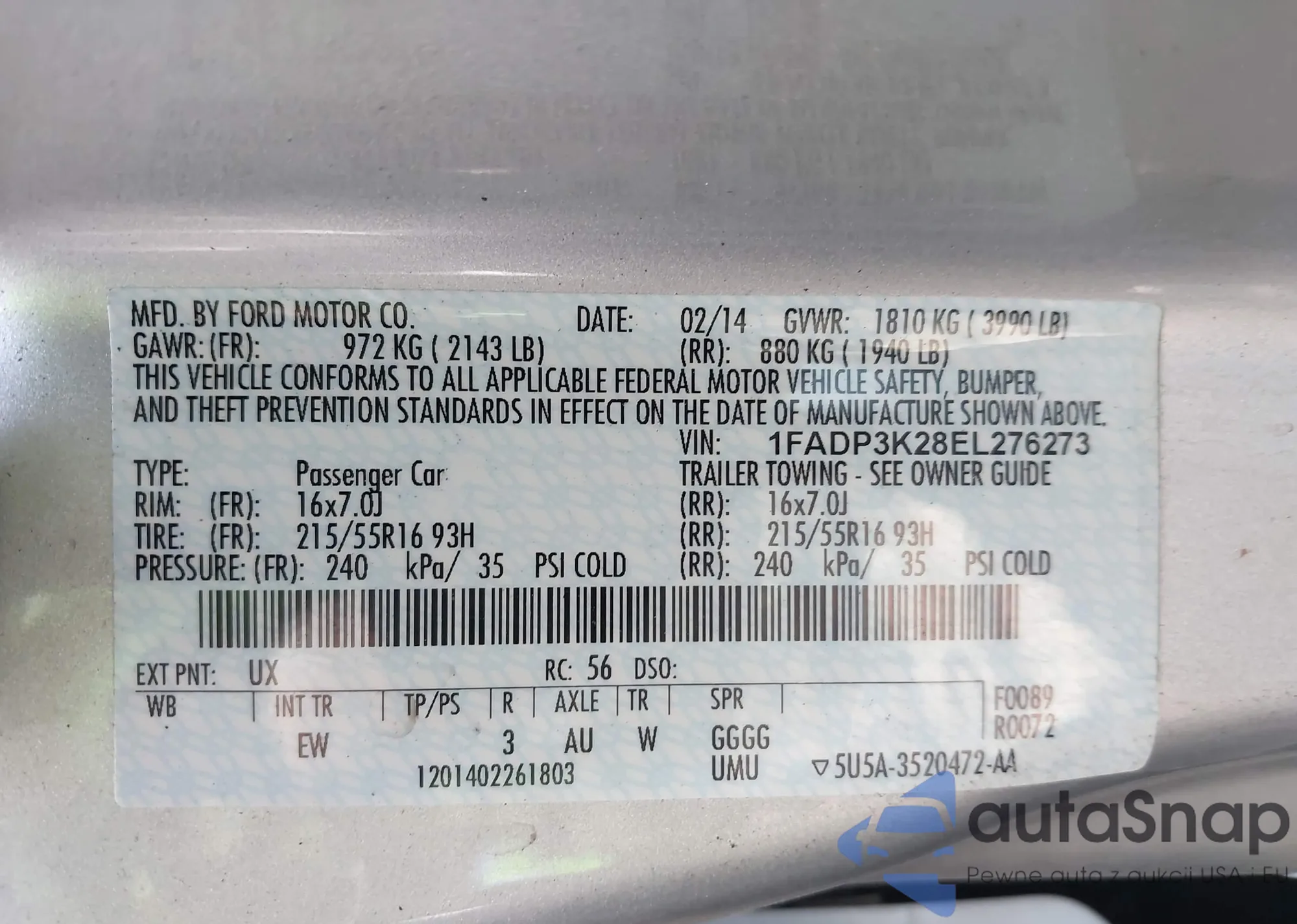 VIN: 1FADP3K28EL276273