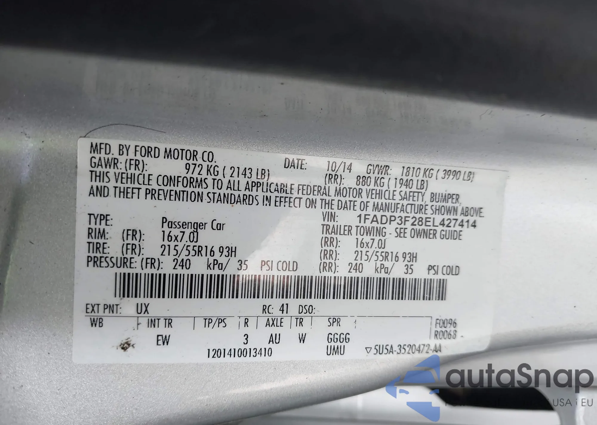 VIN: 1FADP3F28EL427414