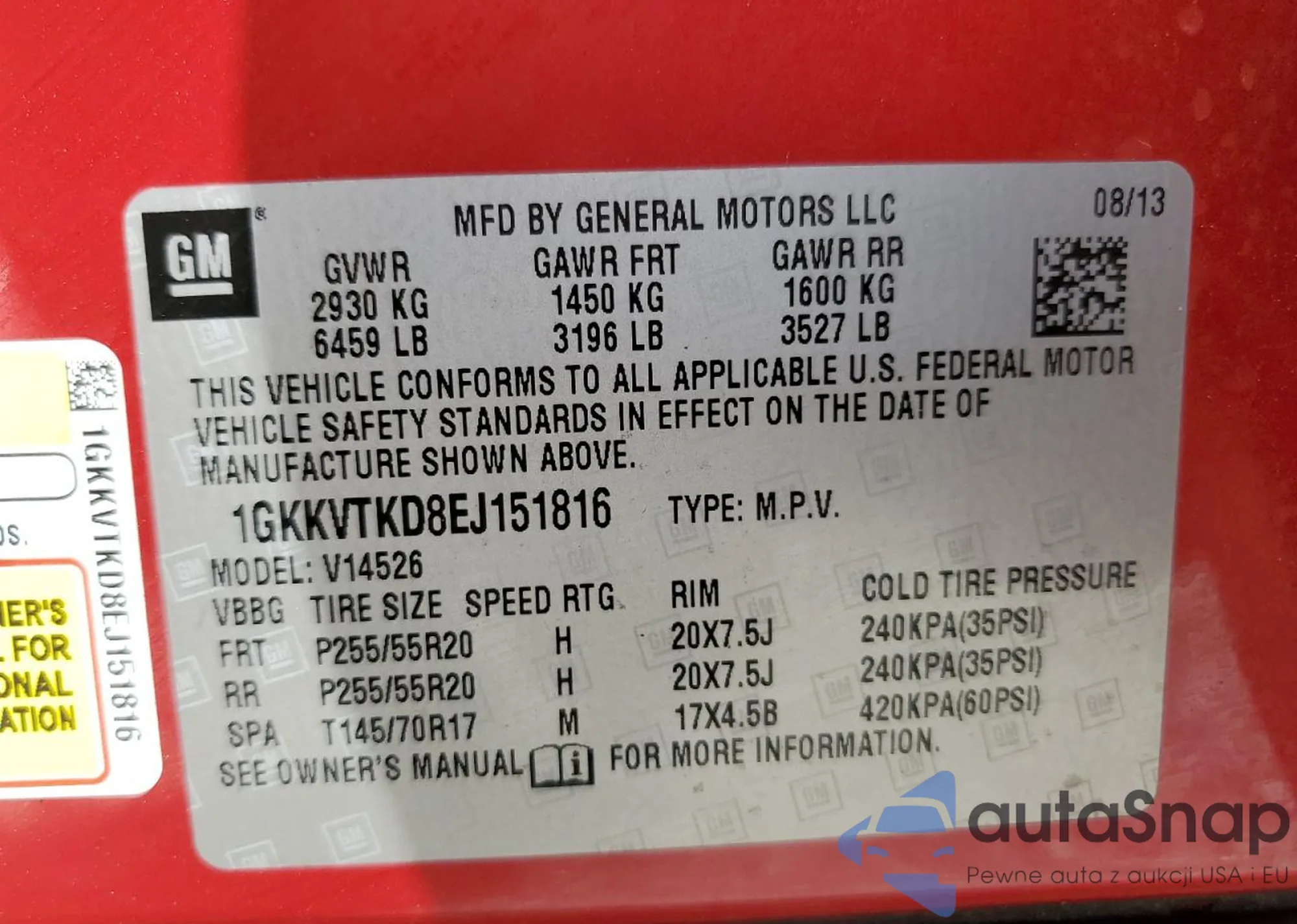 Samochód GMC Acadia 2014 (VIN 1GKKVTKD8EJ151816) ma dokumenty uniemożliwiające rejestrację. Mogą pojawić się trudności przy eksporcie i rejestracji. Skontaktuj się z ekspertami AutaSnap w celu znalezienia alternatywy.