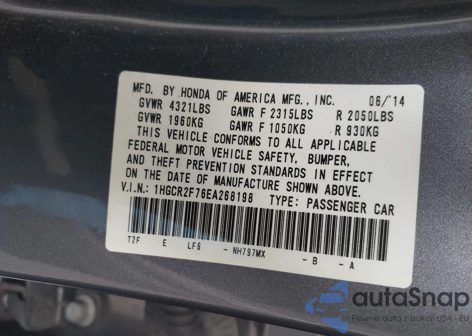 VIN: 1HGCR2F76EA268198