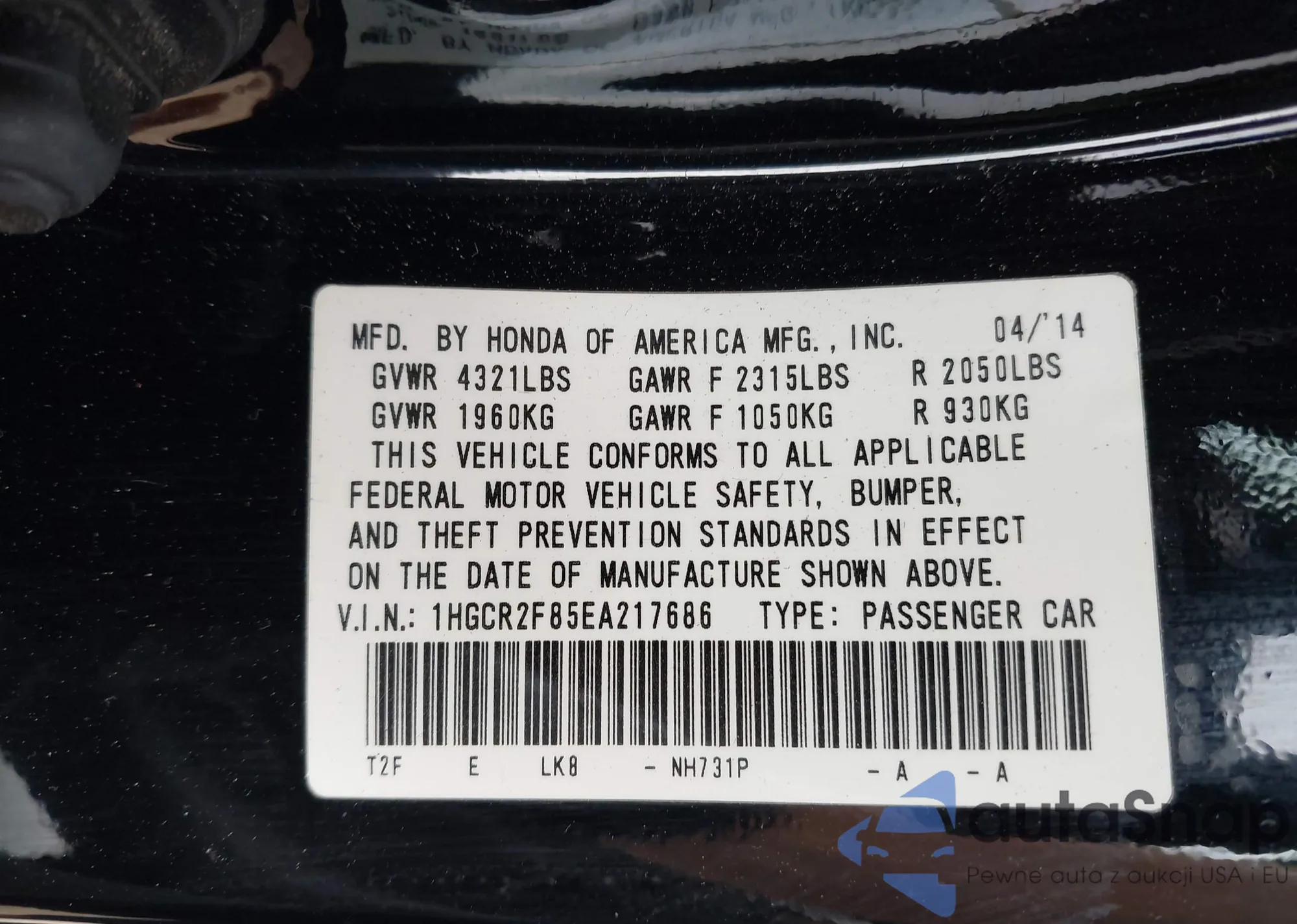 VIN: 1HGCR2F85EA217686