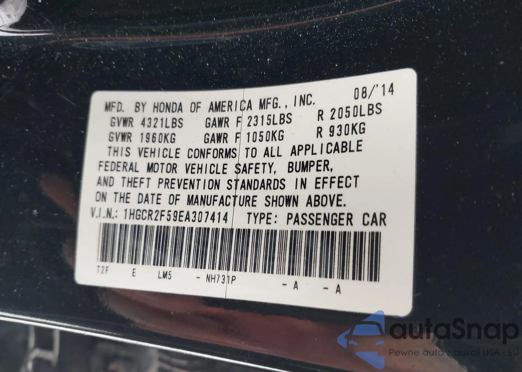 • VIN: 1HGCR2F59EA307414