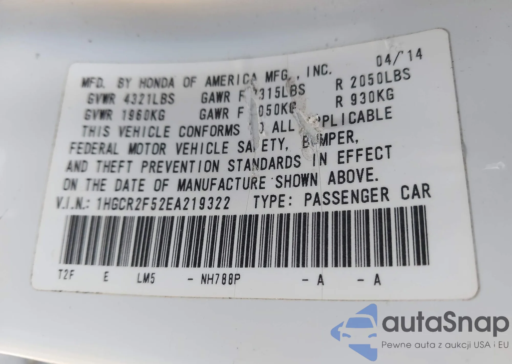 VIN: 1HGCR2F52EA219322