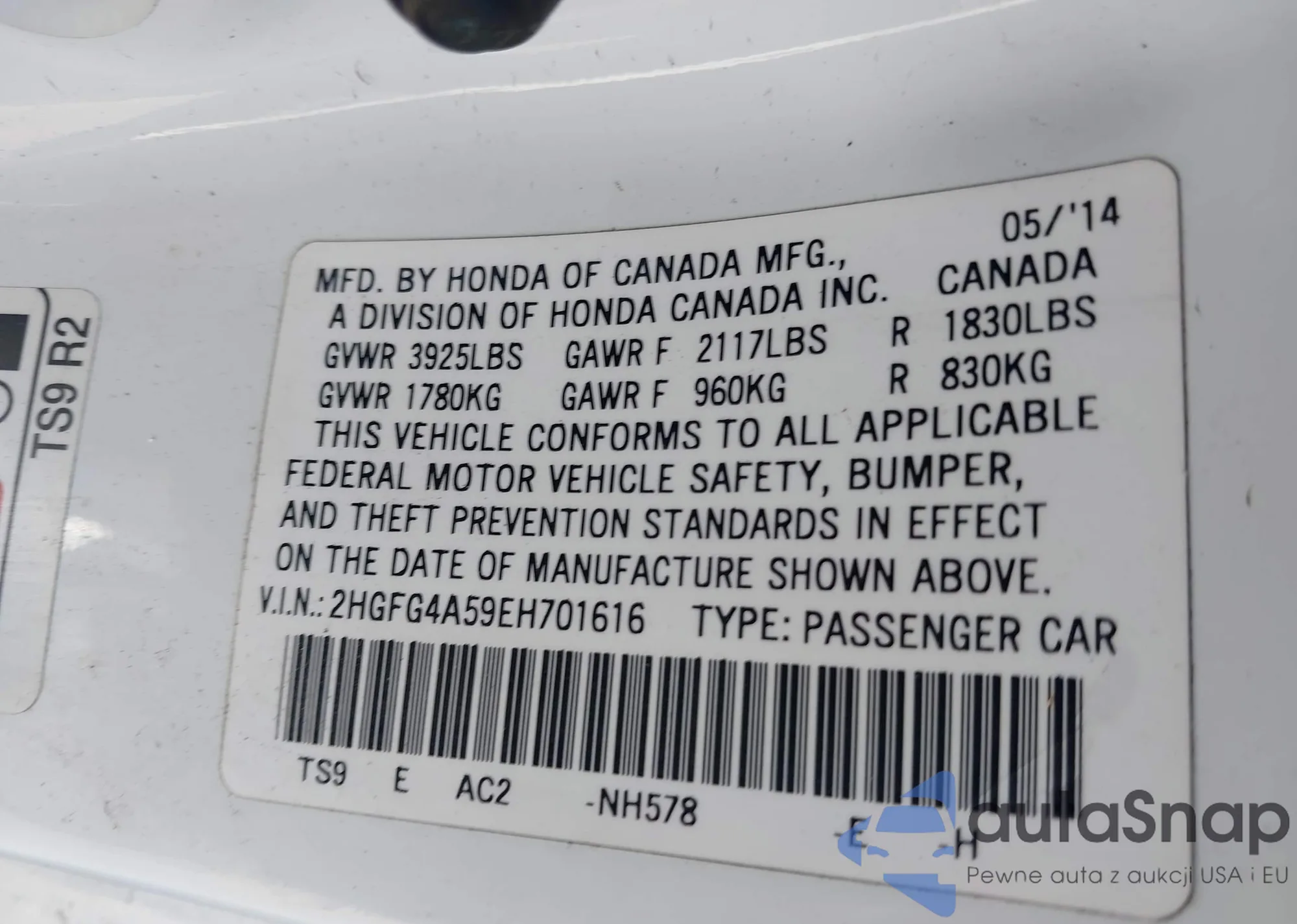 VIN: 2HGFG4A59EH701616