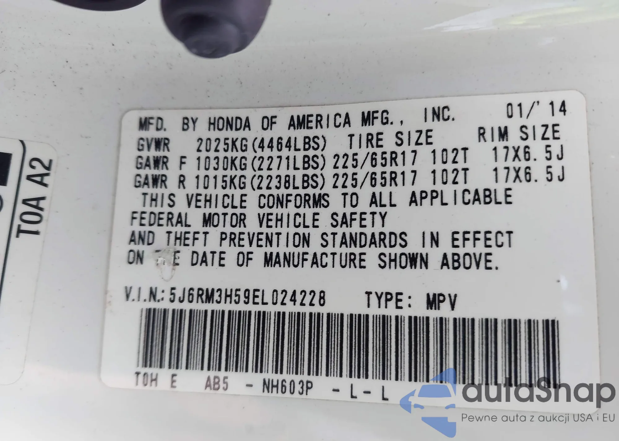 VIN: 5J6RM3H59EL024228