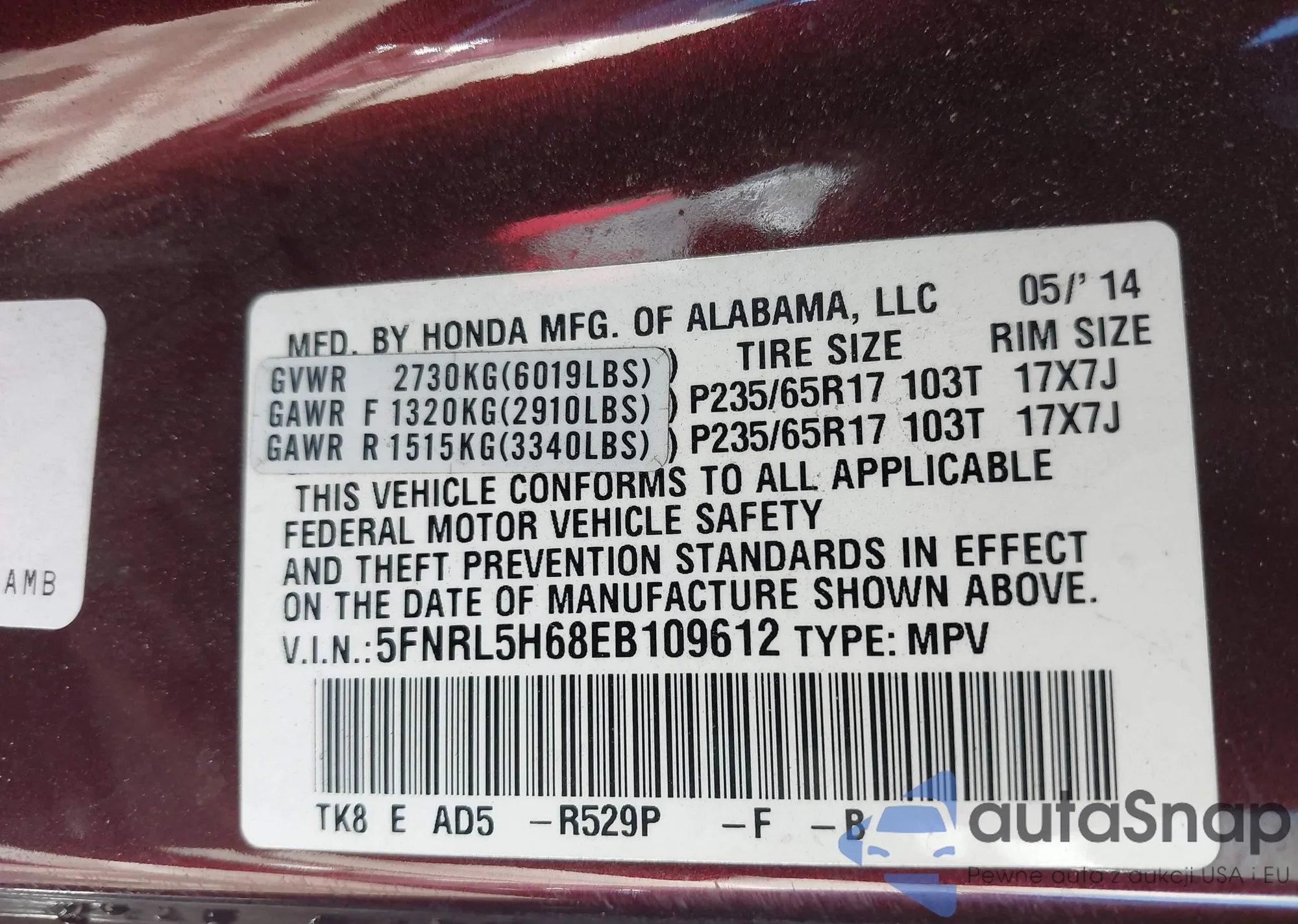 Samochód Honda Odyssey 2014 (VIN 5FNRL5H68EB109612) nie był wcześniej licytowany. Dokumenty są czyste, przebieg odpowiada lub jest niższy niż średnia rynku. Sprzedaje go firma ubezpieczeniowa – polecamy zakup. Dostawa do portu zajmie ok. 6–8 tygodni.