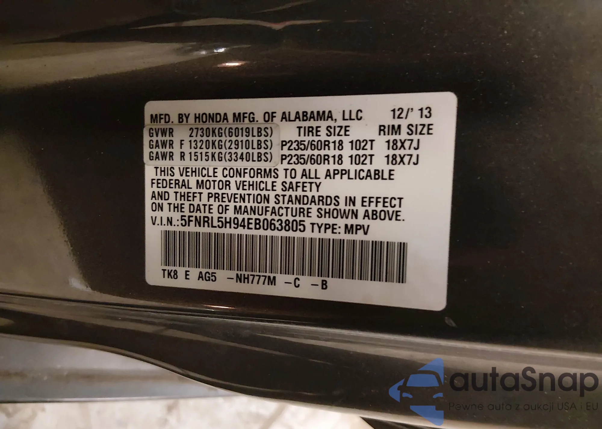 • VIN: 5FNRL5H94EB063805