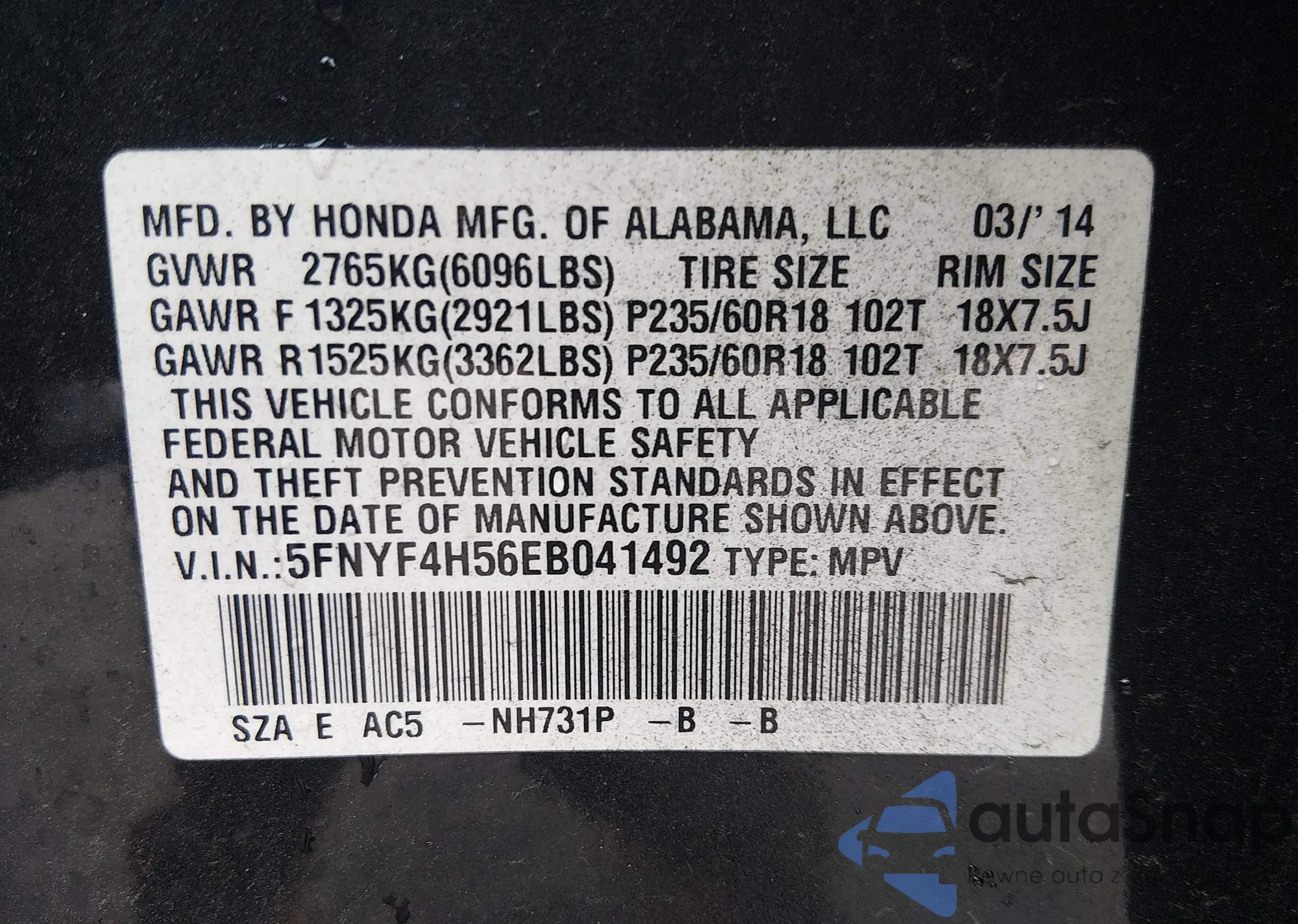 VIN: 5FNYF4H56EB041492