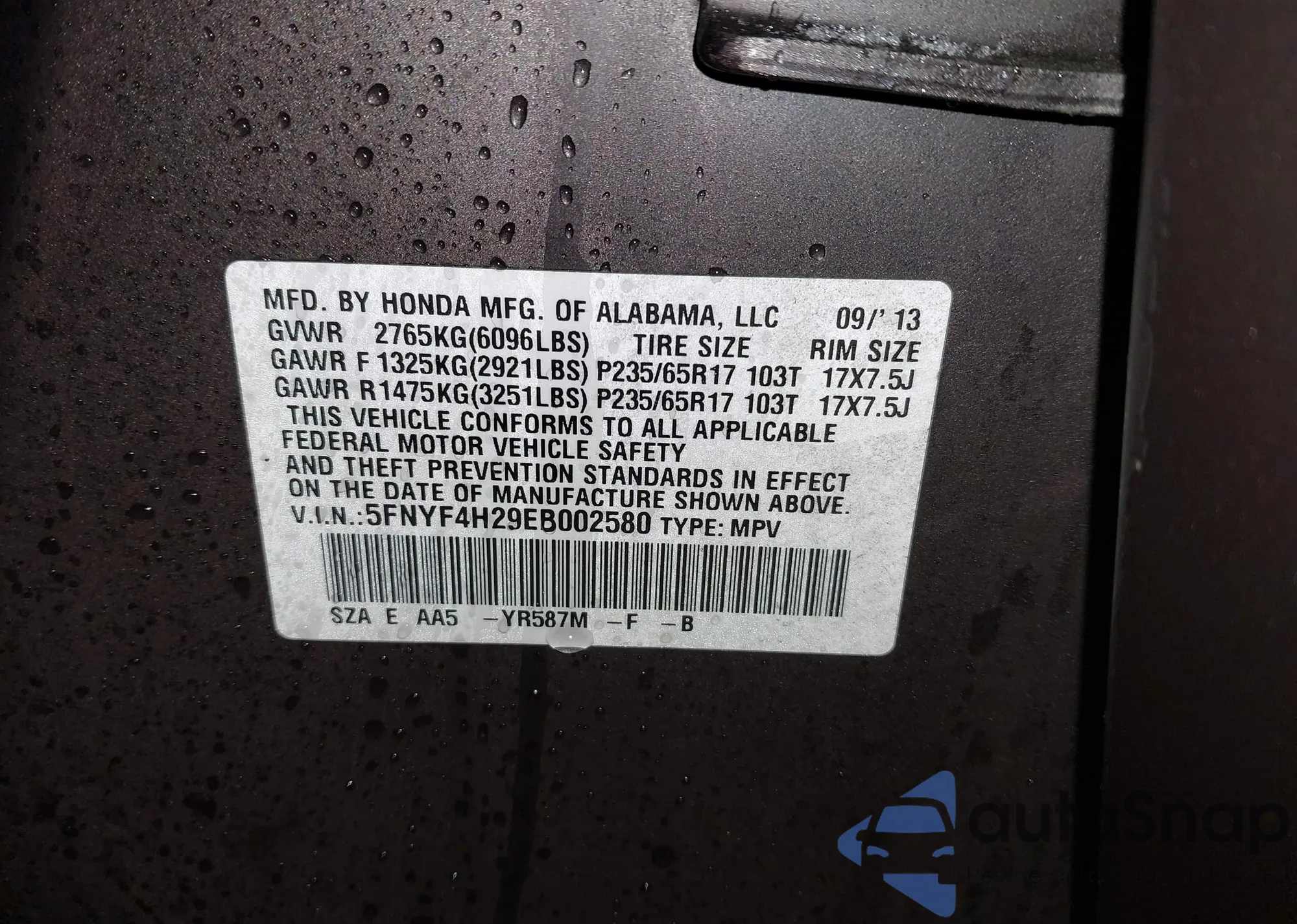 VIN: 5FNYF4H29EB002580