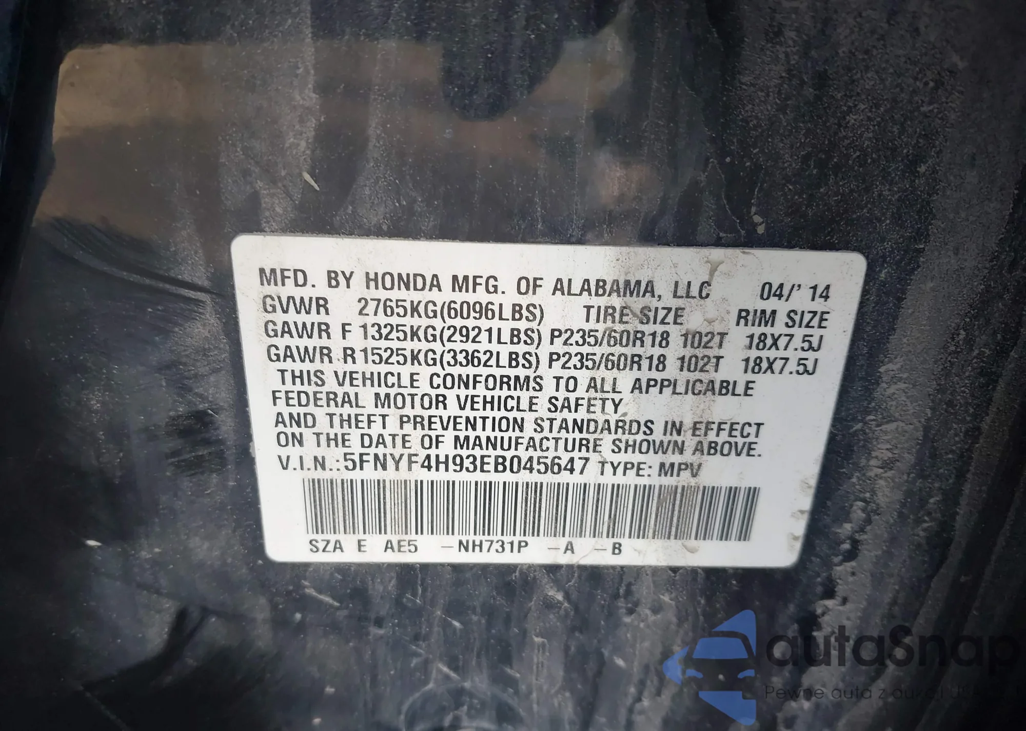 VIN: 5FNYF4H93EB045647