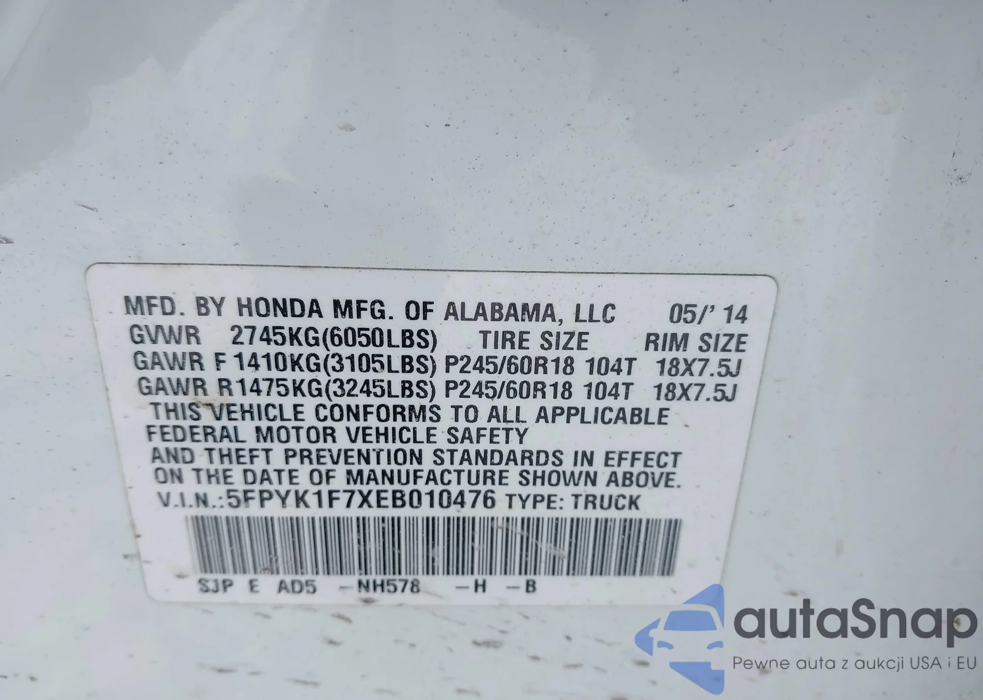 Samochód Honda Ridgeline 2014 (VIN 5FPYK1F7XEB010476) nie był wcześniej licytowany. Dokumenty są czyste, przebieg odpowiada lub jest niższy niż średnia rynku. Sprzedaje go firma ubezpieczeniowa – polecamy zakup. Dostawa do portu zajmie ok. 6–8 tygodni.