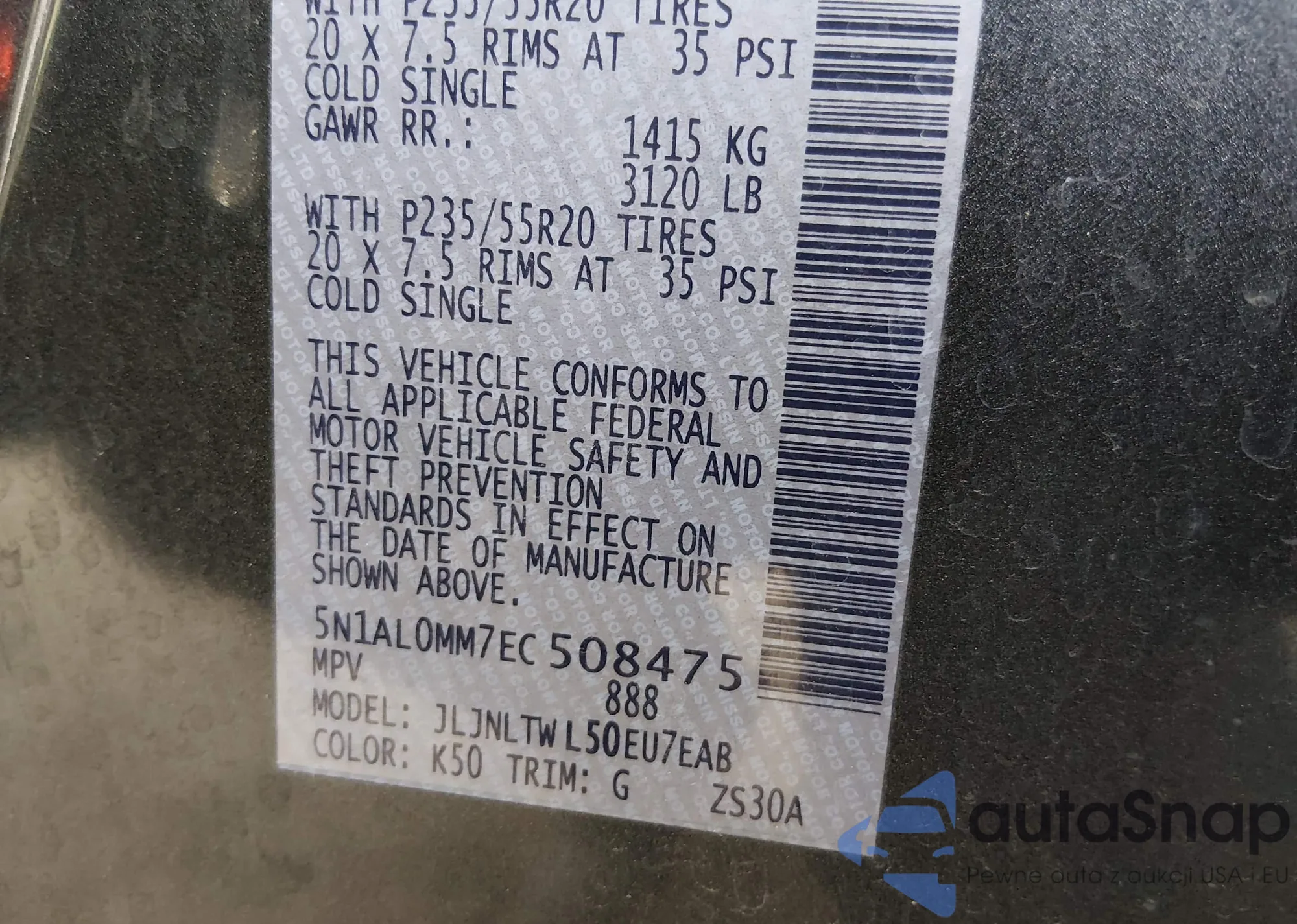 • VIN: 5N1AL0MM7EC508475