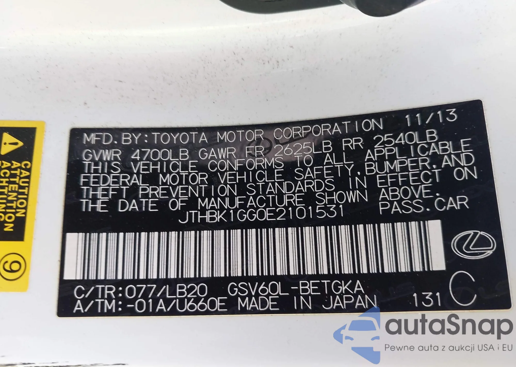 Samochód Lexus ES 2014 (VIN JTHBK1GG0E2101531) nie był wcześniej licytowany. Dokumenty są czyste, przebieg odpowiada lub jest niższy niż średnia rynku. Sprzedaje go firma ubezpieczeniowa – polecamy zakup. Dostawa do portu zajmie ok. 6–8 tygodni.
