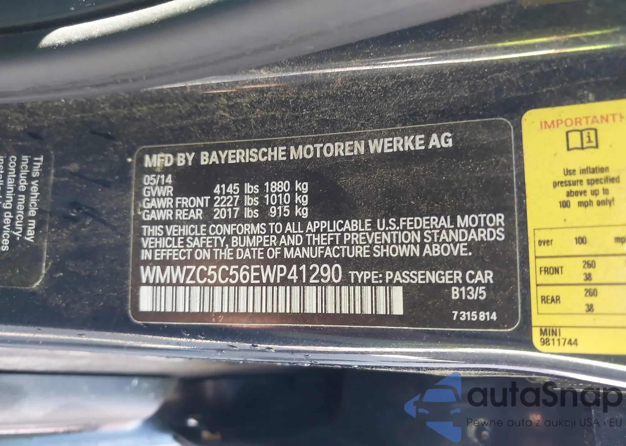 Samochód MINI Countryman 2014 (VIN WMWZC5C56EWP41290) nie był wcześniej licytowany. Dokumenty są czyste, przebieg odpowiada lub jest niższy niż średnia rynku. Sprzedaje go firma ubezpieczeniowa – polecamy zakup. Dostawa do portu zajmie ok. 6–8 tygodni.