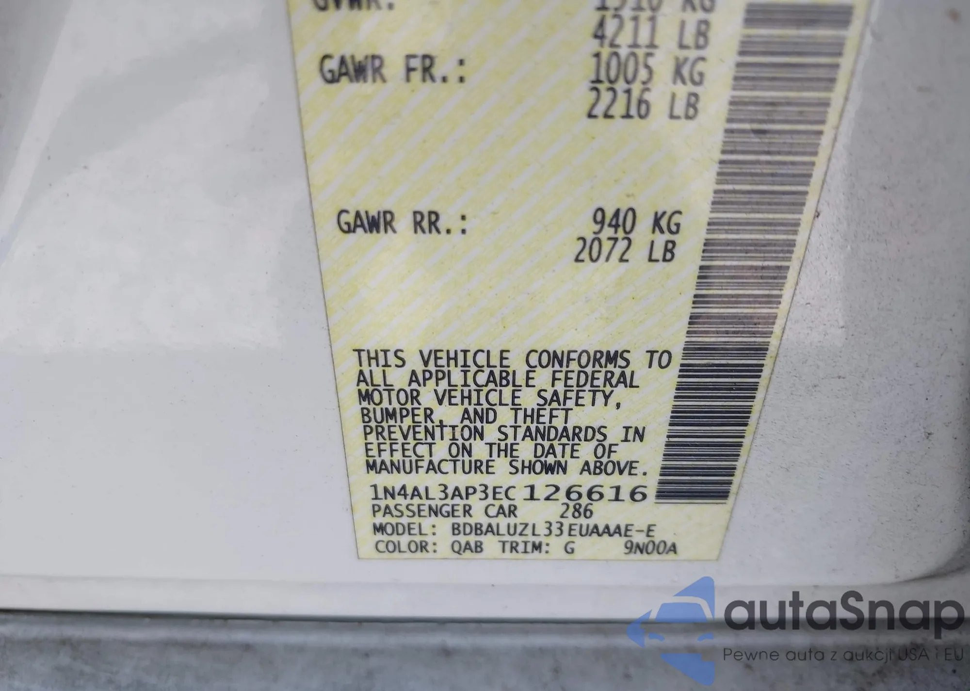 VIN: 1N4AL3AP3EC126616