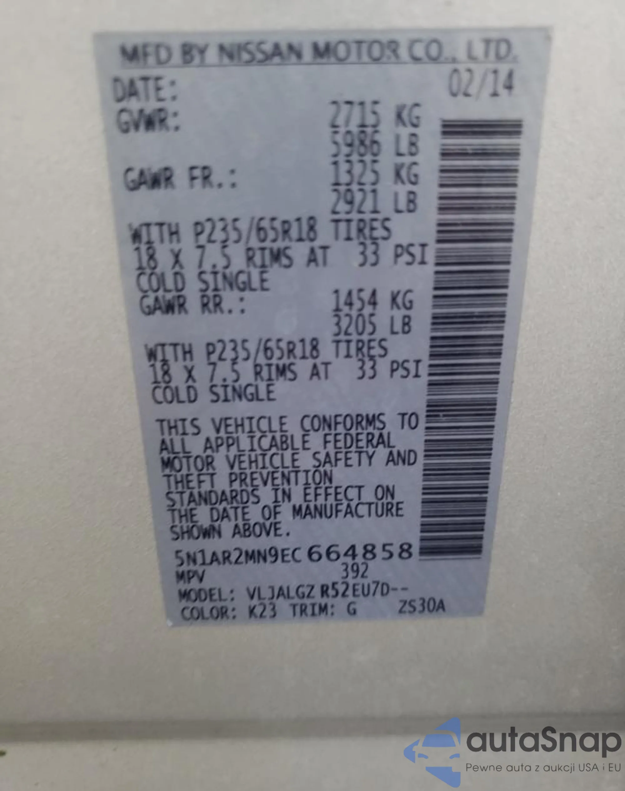 • VIN: 5N1AR2MN9EC664858