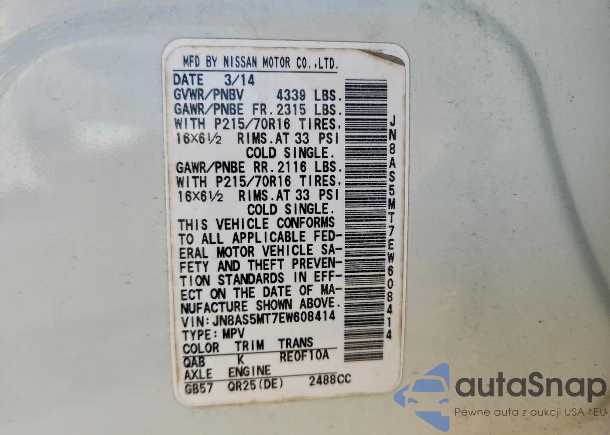 VIN: JN8AS5MT7EW608414