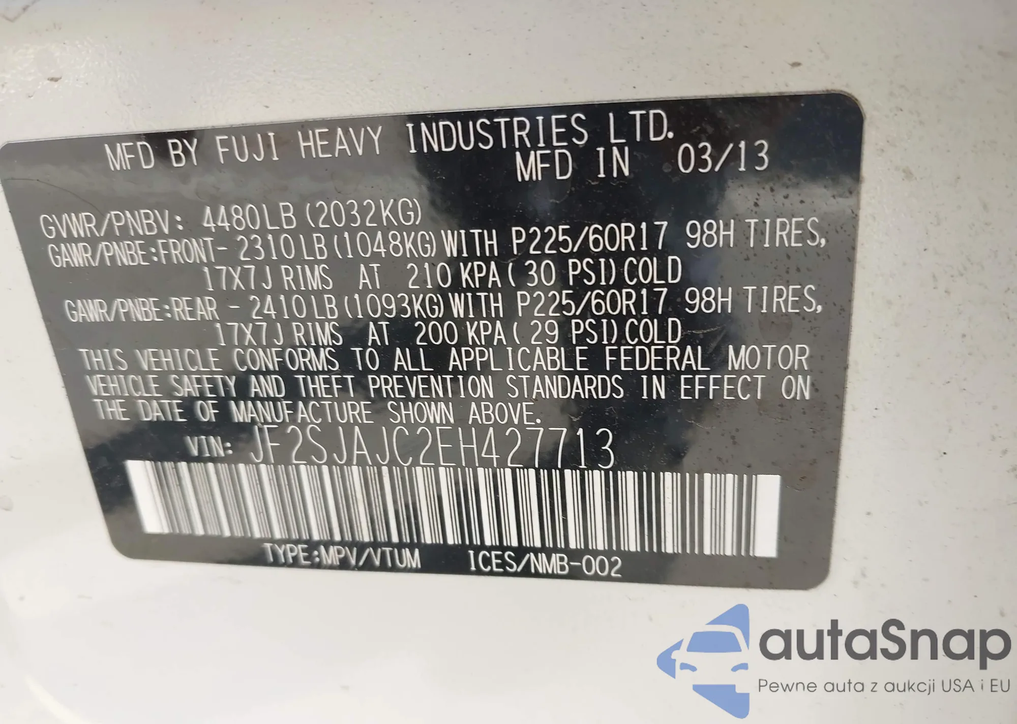 Samochód Subaru Forester 2014 (VIN JF2SJAJC2EH427713) ma dokumenty uniemożliwiające rejestrację. Mogą pojawić się trudności przy eksporcie i rejestracji. Skontaktuj się z ekspertami AutaSnap w celu znalezienia alternatywy.
