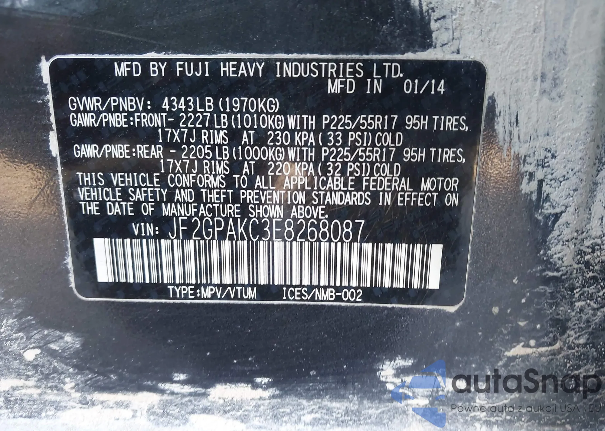 Samochód Subaru XV 2014 (VIN JF2GPAKC3E8268087) nie był wcześniej licytowany. Dokumenty są czyste, przebieg odpowiada lub jest niższy niż średnia rynku. Sprzedaje go firma ubezpieczeniowa – polecamy zakup. Dostawa do portu zajmie ok. 6–8 tygodni.